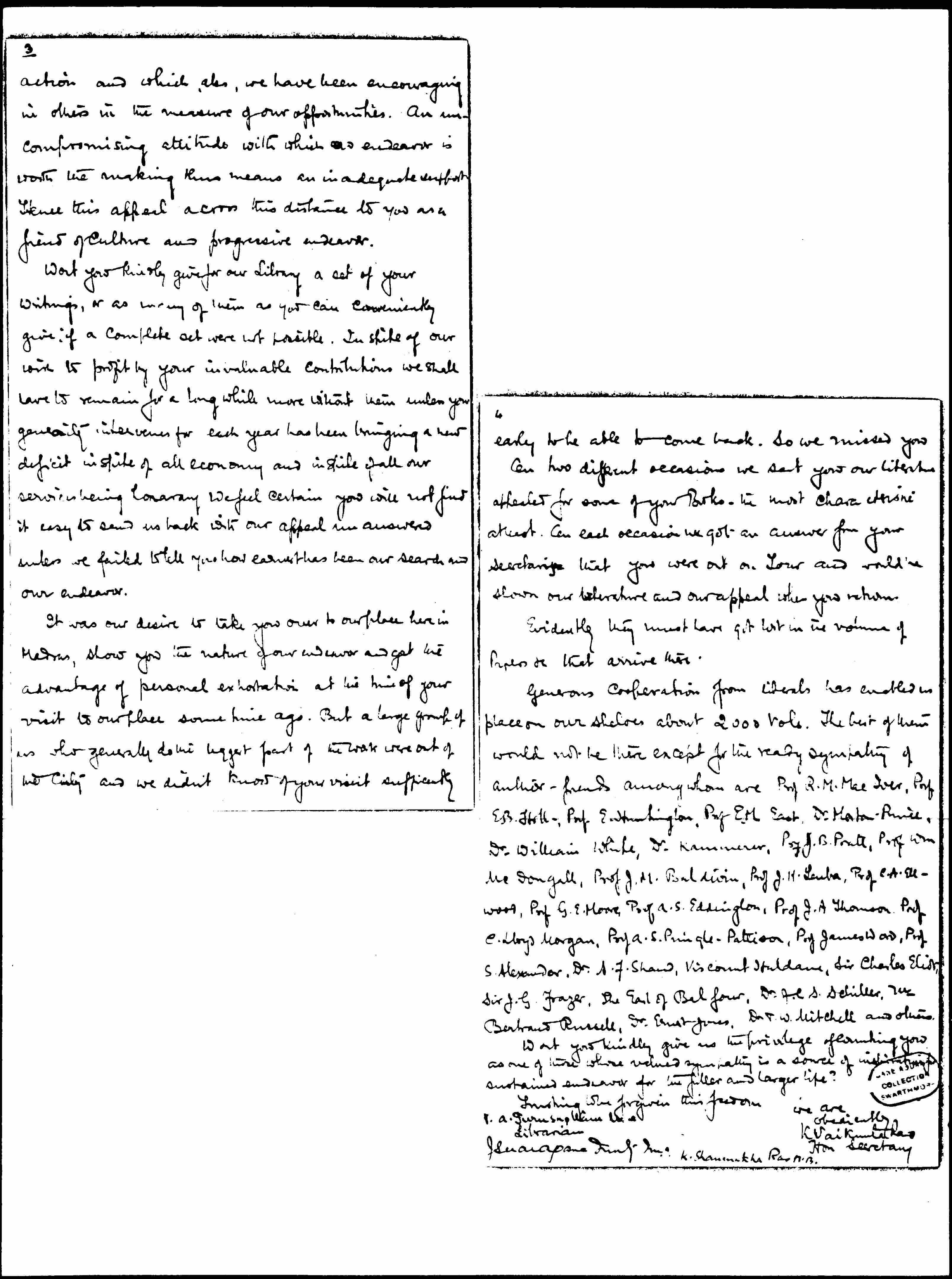 Won’t you kindly give for our Library a set of your writings, or as many of them you can conveniently give, if a complete set were not possible. In spite of of our work to profit by your invaluable contributions we shall have to remain for a long while more without them unless your generosity intervenes for each year has been bringing in a new deficit in spite of all economy and in spite of all our services being honorary. We feel certain that you not will find it easy to send us back with our appeal unanswered unless we failed to tell you how earnest has been our search and our endeavor.