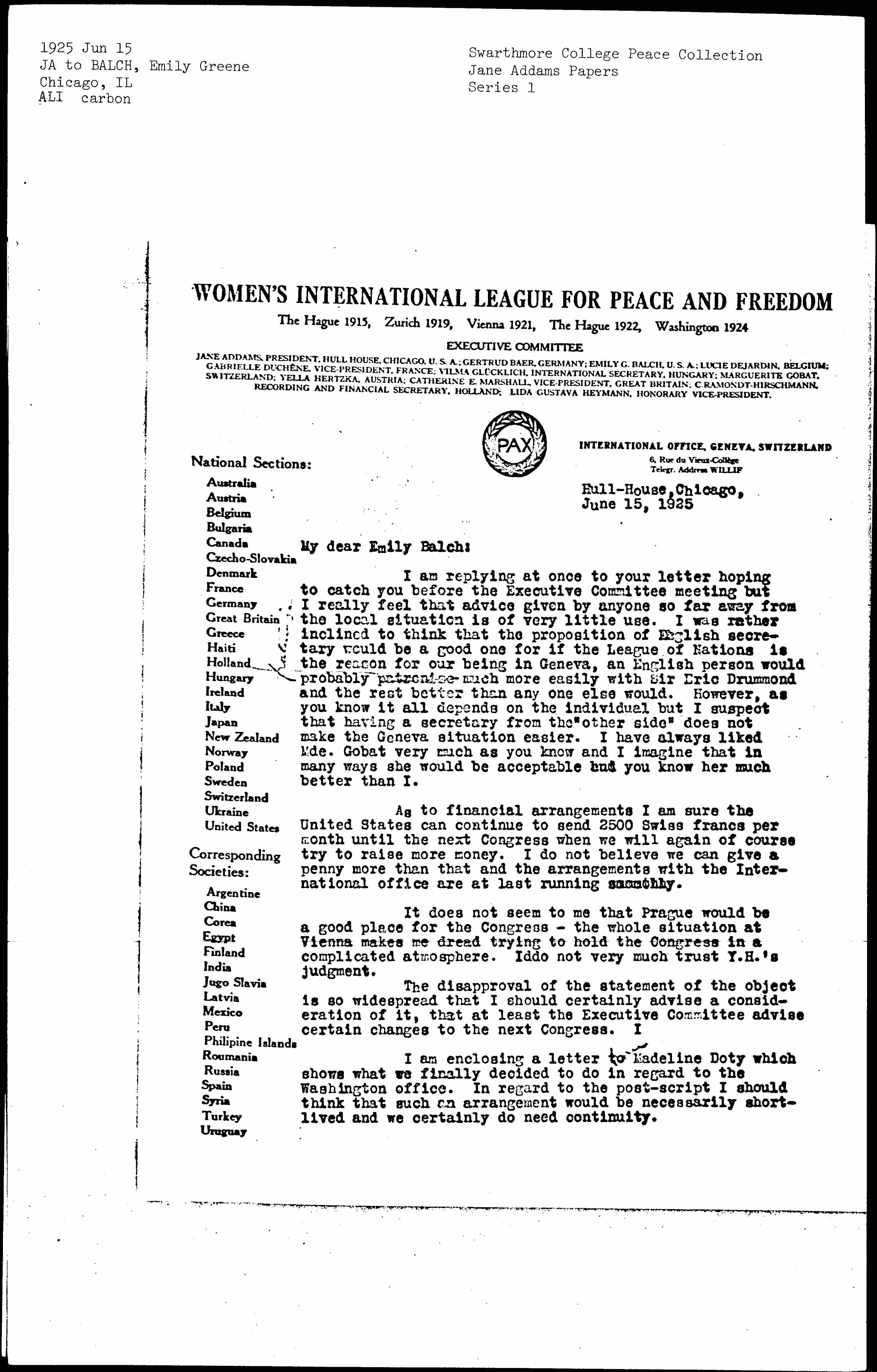 As to financial arrangements I am sure the United States can continue to send 2500 Swiss francs per month until the next Congress when we will again of course try to raise more money. I do not believe we can give a penny more than that and the arrangements with the International office are at last running smoothly.