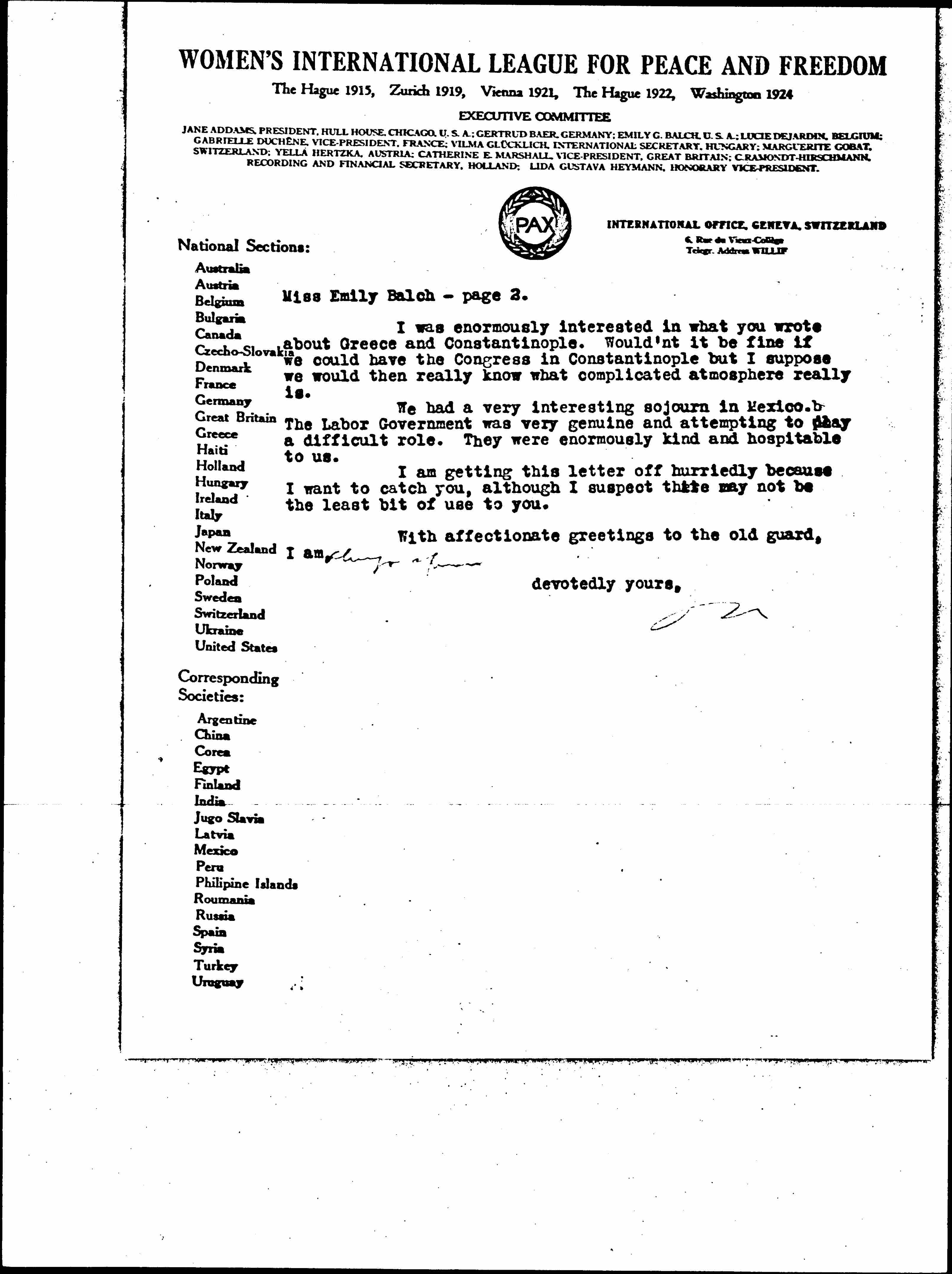 I am replying at once to your letter hoping to catch you before the Executive Committee meeting but I really feel that advice given by anyone so far away from the local situation is of very little use. I was rather inclined to think that the proposition of English secretary would be a good one for if the League of Nations is the reason for our being in Geneva, an English person would probably patronize ↑[fraternize]↓ much more easily with Sir Eric Drummond and the rest better than any one else would. However, as you know it all depends on the individual but I suspect that having a secretary from the "other side" does not make the Geneva situation easier. I have always liked Mde. Gobat very much as you know and I imagine that in many ways she would be acceptable and you know her much better than I.