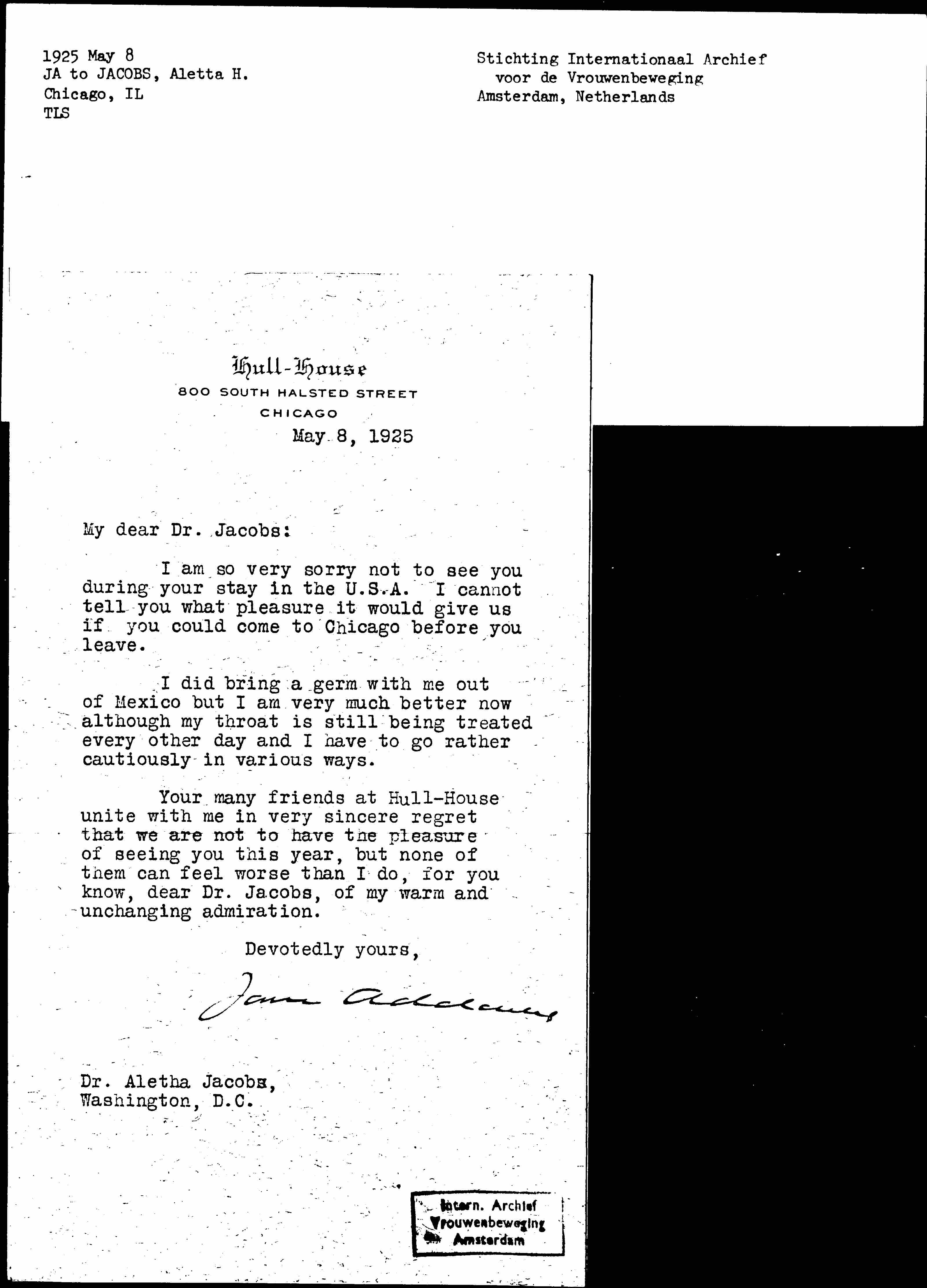 Your many friends at Hull-House unite with me in very sincere regret that we are not to have the pleasure of seeing you this year, but none of them can feel worse than I do, for you know, dear Dr. Jacobs, of my warm and unchanging admiration.