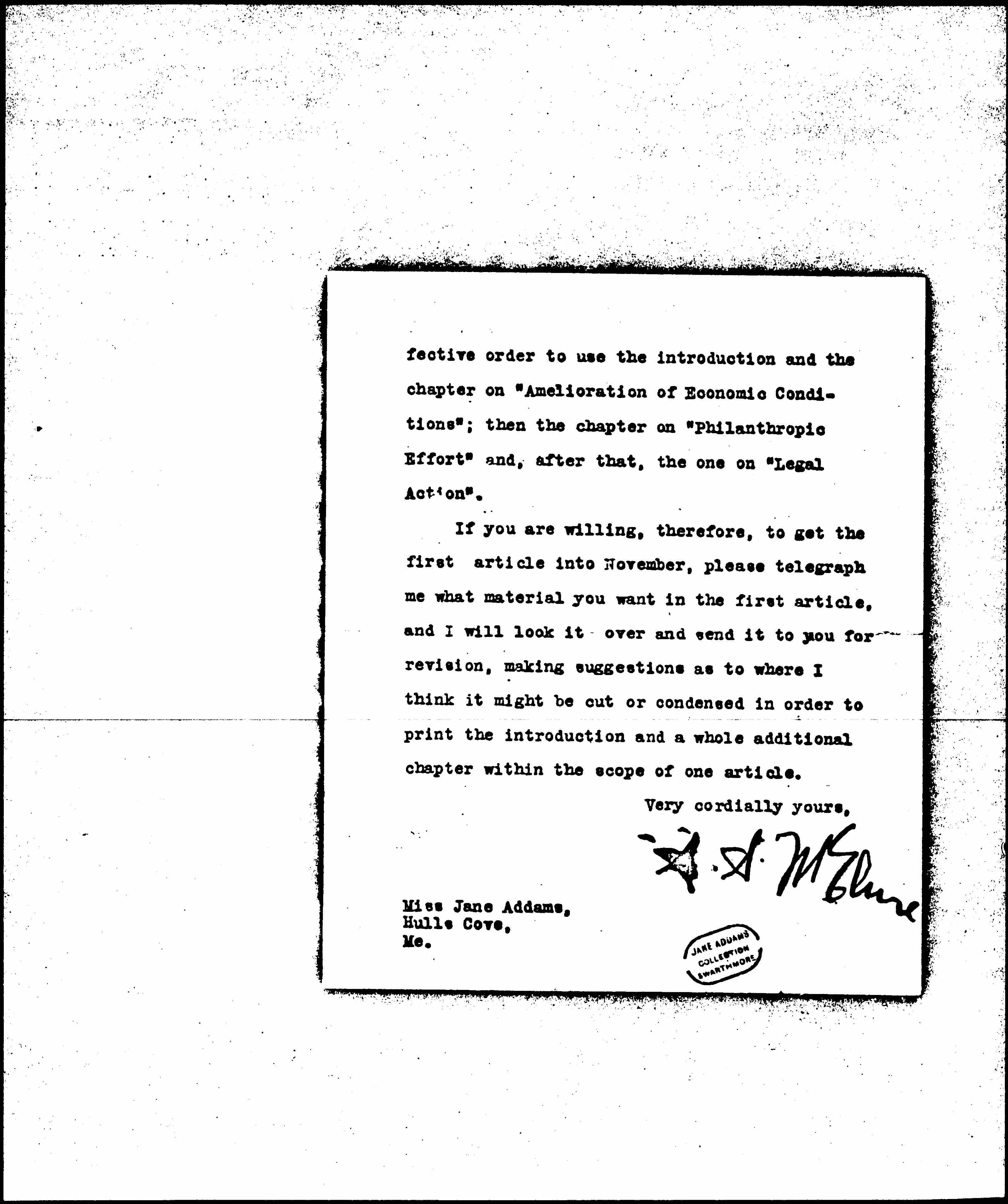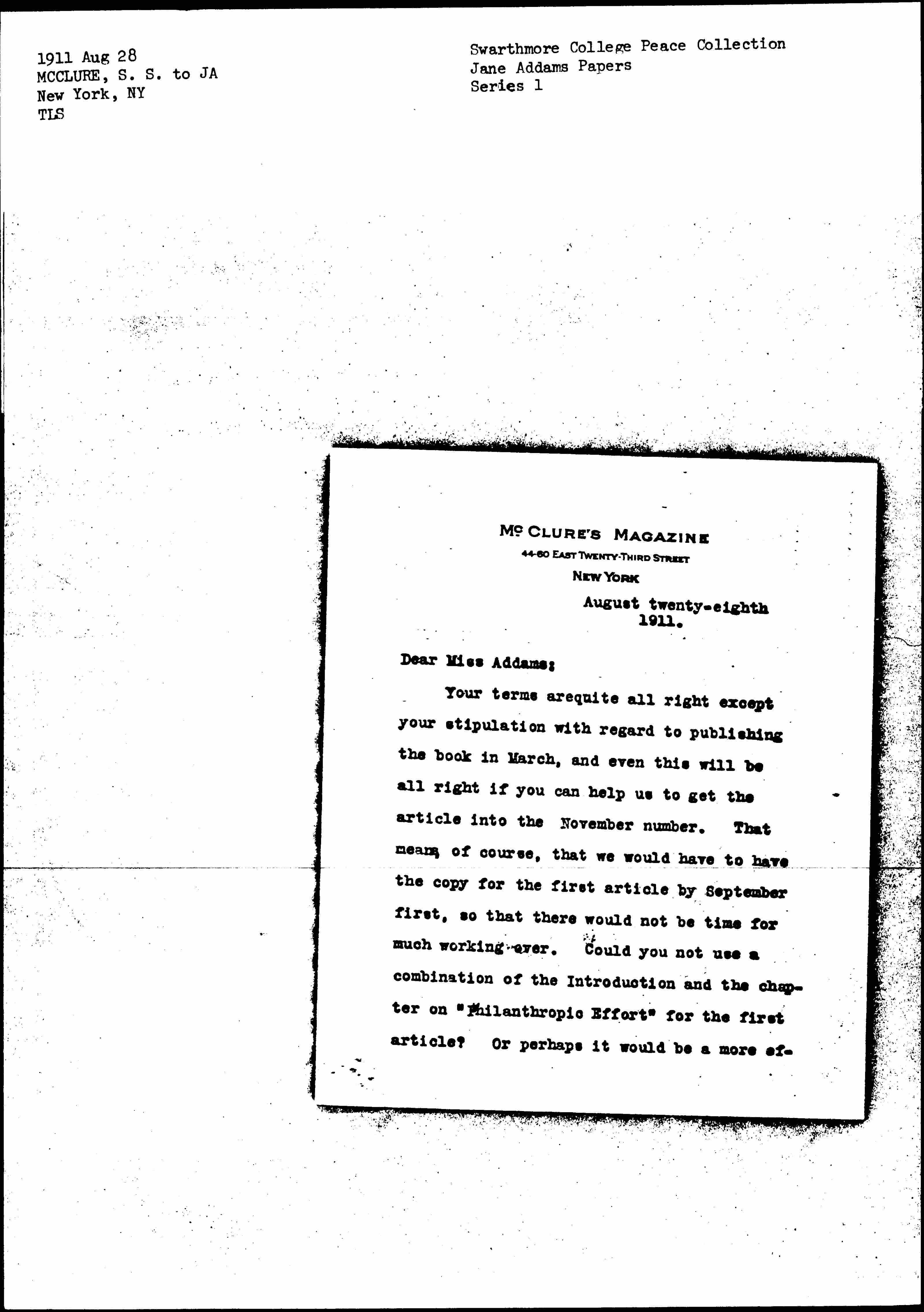Your terms are quite all right except your stipulation with regard to publishing the book in March, and even this will be all right if you can help us to get the article into the November number. That means, of course, that we would have to have the copy for the first article by September first, so that there would not be time for much working over. Could you not use a combination of the Introduction and the chapter on "Philanthropic Effort" for the first article? Or perhaps it would be a more effective [page 2] order to use the introduction and the chapter on "Amelioration of Economic Conditions"; then the chapter on "Philanthropic Effort" and, after that, the one on "Legal Action".