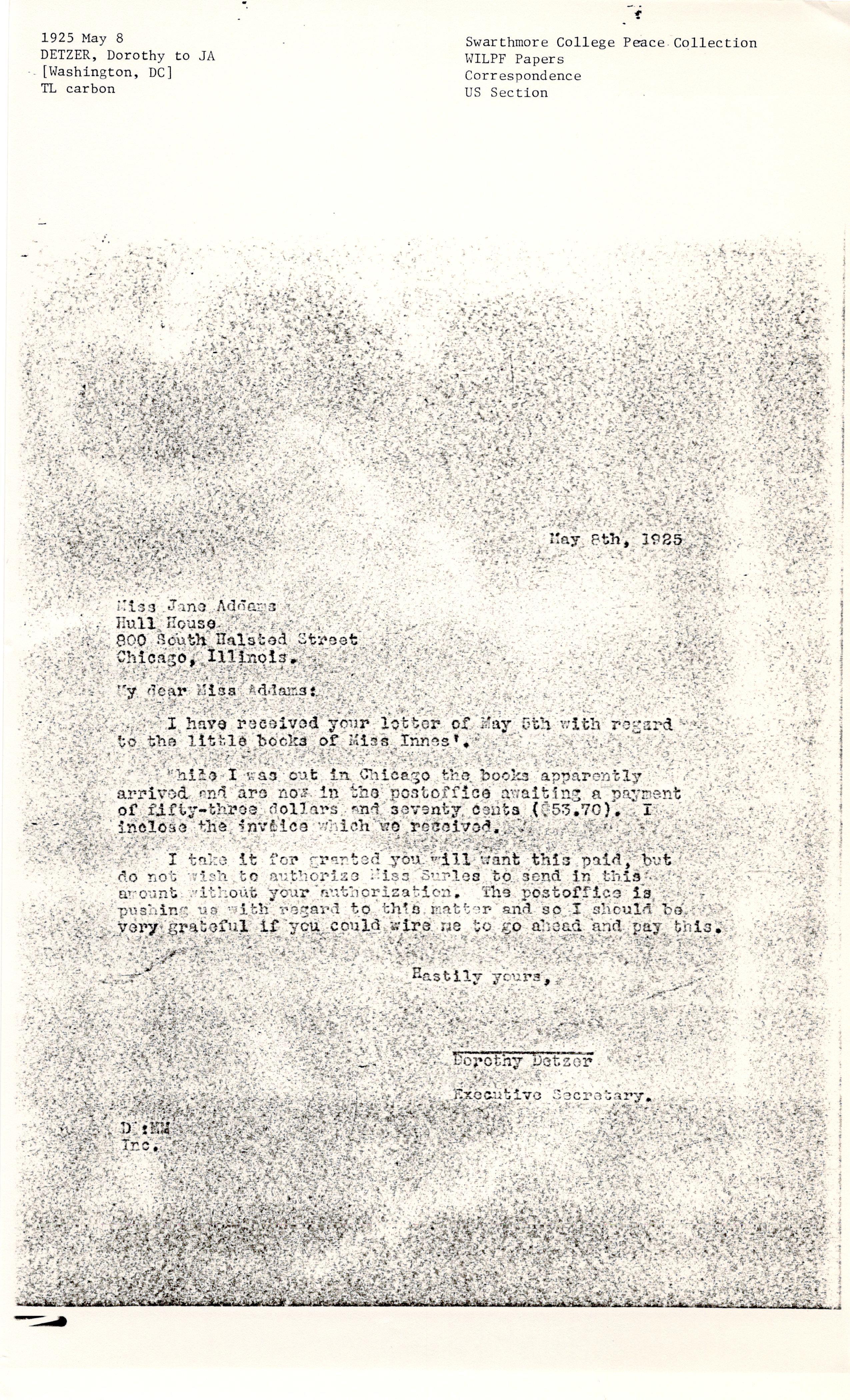 While I was out in Chicago the books apparently arrived and are now in the post office awaiting a payment of fifty-three dollars and seventy cents ($53.70). I [enclose] the invoice which we received.