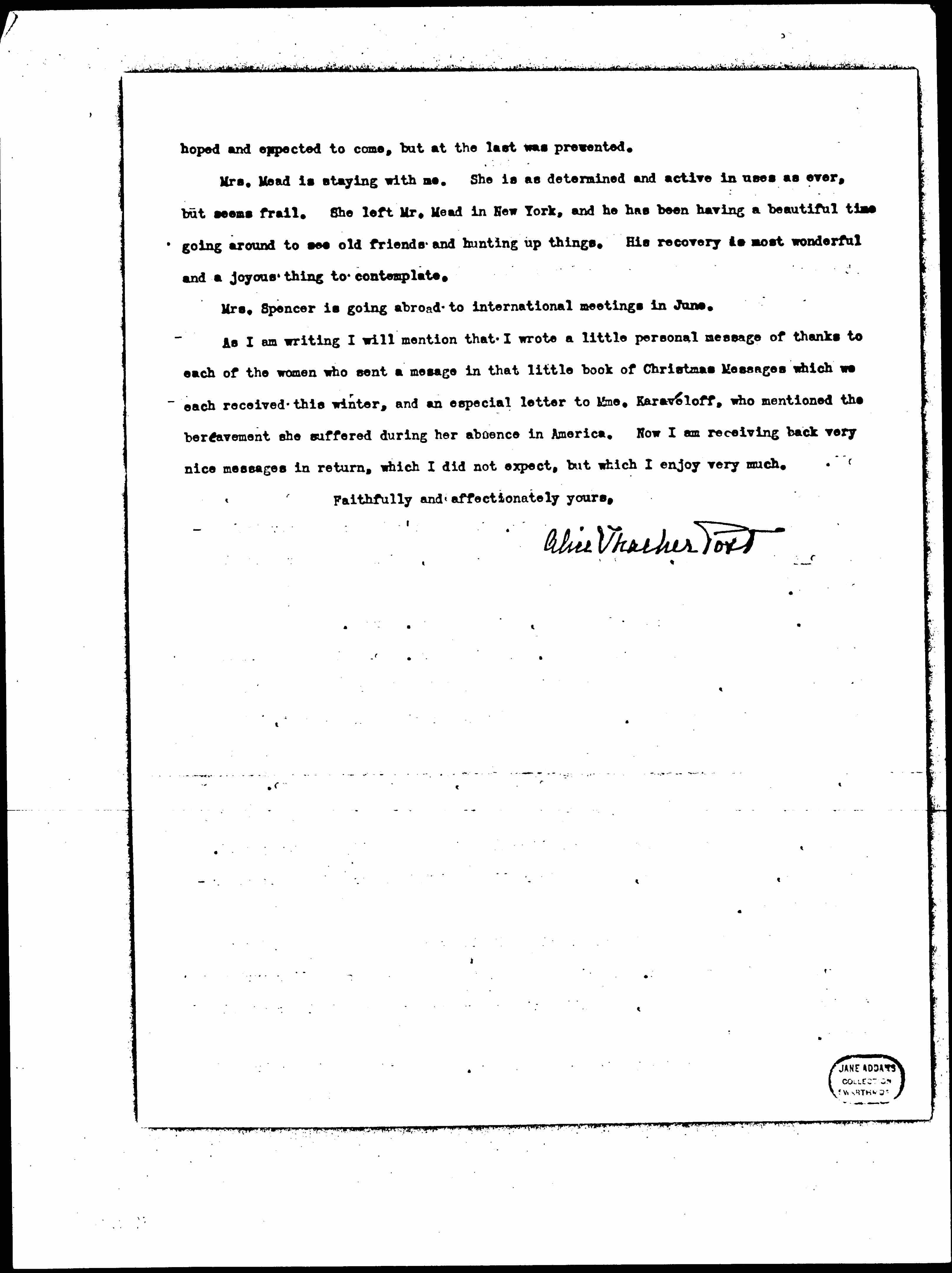 As I am writing I will mention that I wrote a little personal message of thanks to each of the women who sent a [message] in that little book of Christmas Messages which we each received this winter, and an especial letter to Mme. Karavéloff, who mentioned the bereavement she suffered during her absence in America. Now I am receiving back very nice messages in return, which I did not expect, but I enjoy very much.