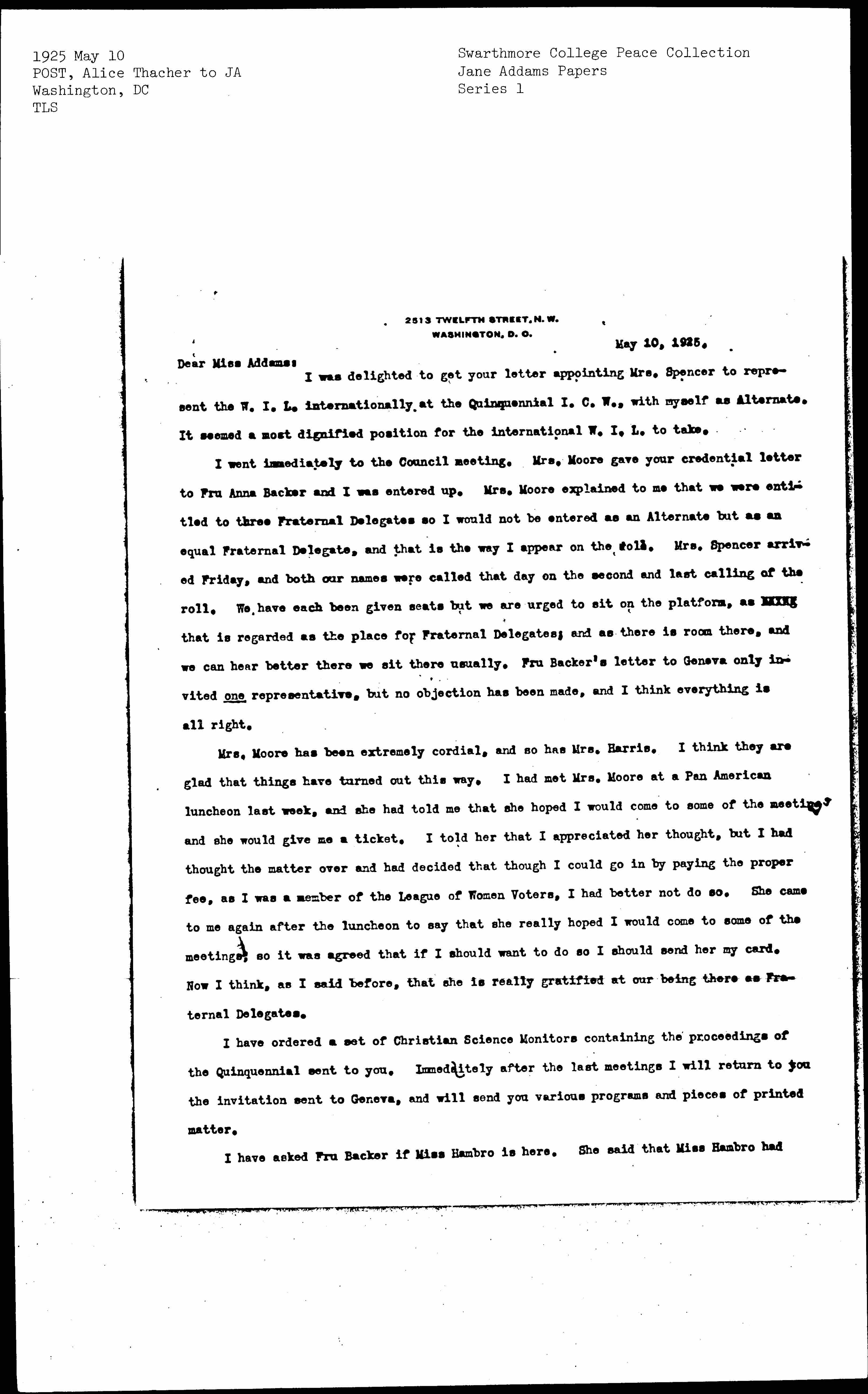 I went immediately to the Council meeting. Mrs. Moore gave your credential letter to Fru Anna Backer and I was entered up. Mrs. Moore explained to me that we were entitled to three Fraternal Delegates so I would not be entered as an Alternate but as an equal Fraternal Delegate, and that is the way I appear on the roll. Mrs. Spencer arrived Friday, and both our names were called that day on the second and last calling of the roll. We have each been given seats but we are urged to sit on the platform, as [illegible] that is regarded as the place for Fraternal Delegates; and as there is room there, and we can hear better there we sit there usually. Fru Backer’s letter to Geneva only invited one representative, but no objection has been made, and I think everything is all right.