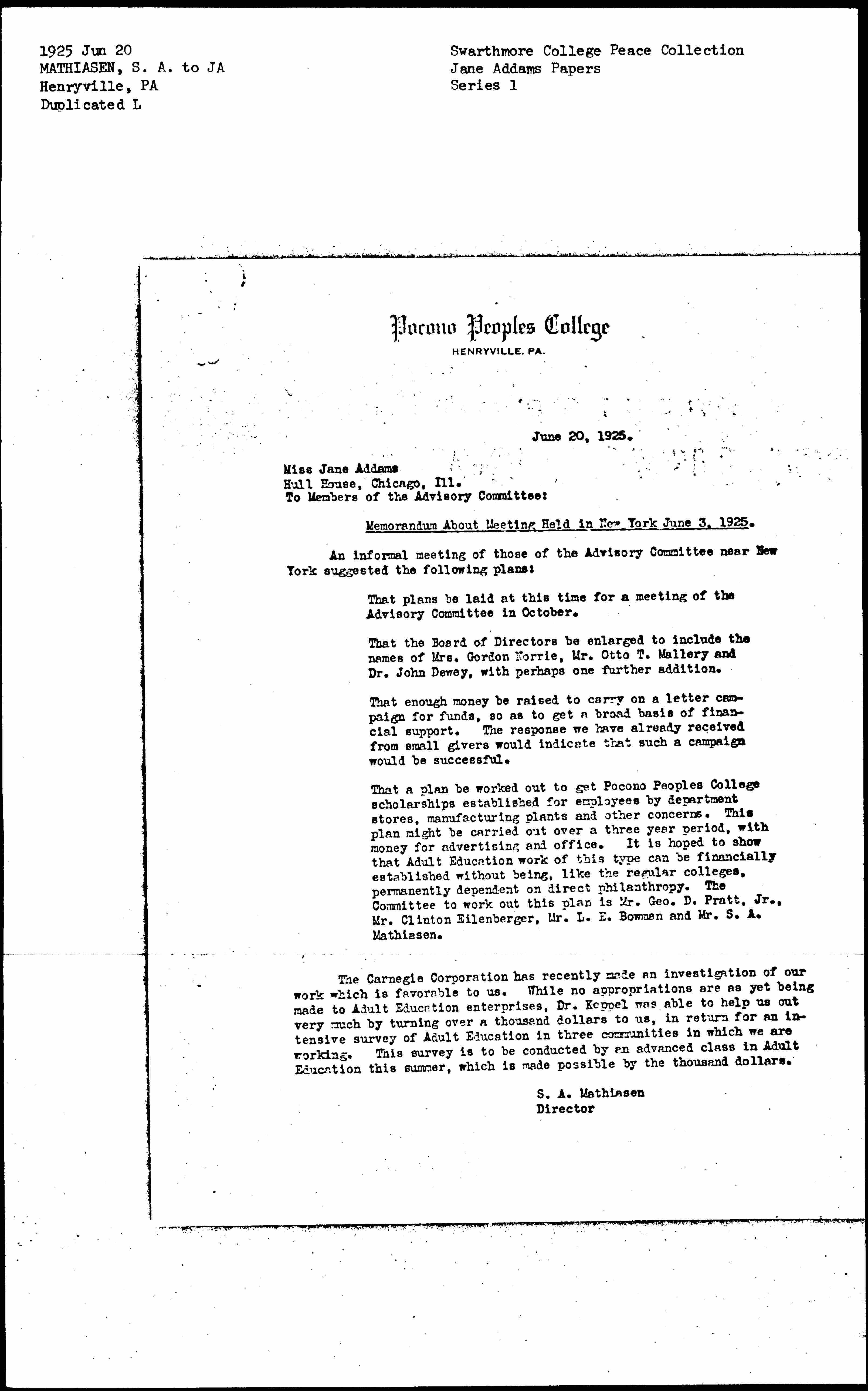 That a plan be worked out to get Pocono Peoples College scholarships established for employees by department stores, manufacturing plants and other concerns. This plan might be carried out over a three year period, with money for advertising and office. It is hoped to show that Adult Education work of this type can be financially established without being, like the regular colleges, permanently dependent on direct philanthropy. The Committee to work out this plan is Mr. Geo. D. Pratt, Jr., Mr. Clinton Eilenberger, Mr. L. E. Bowman and Mr. S. A. Mathiasen.