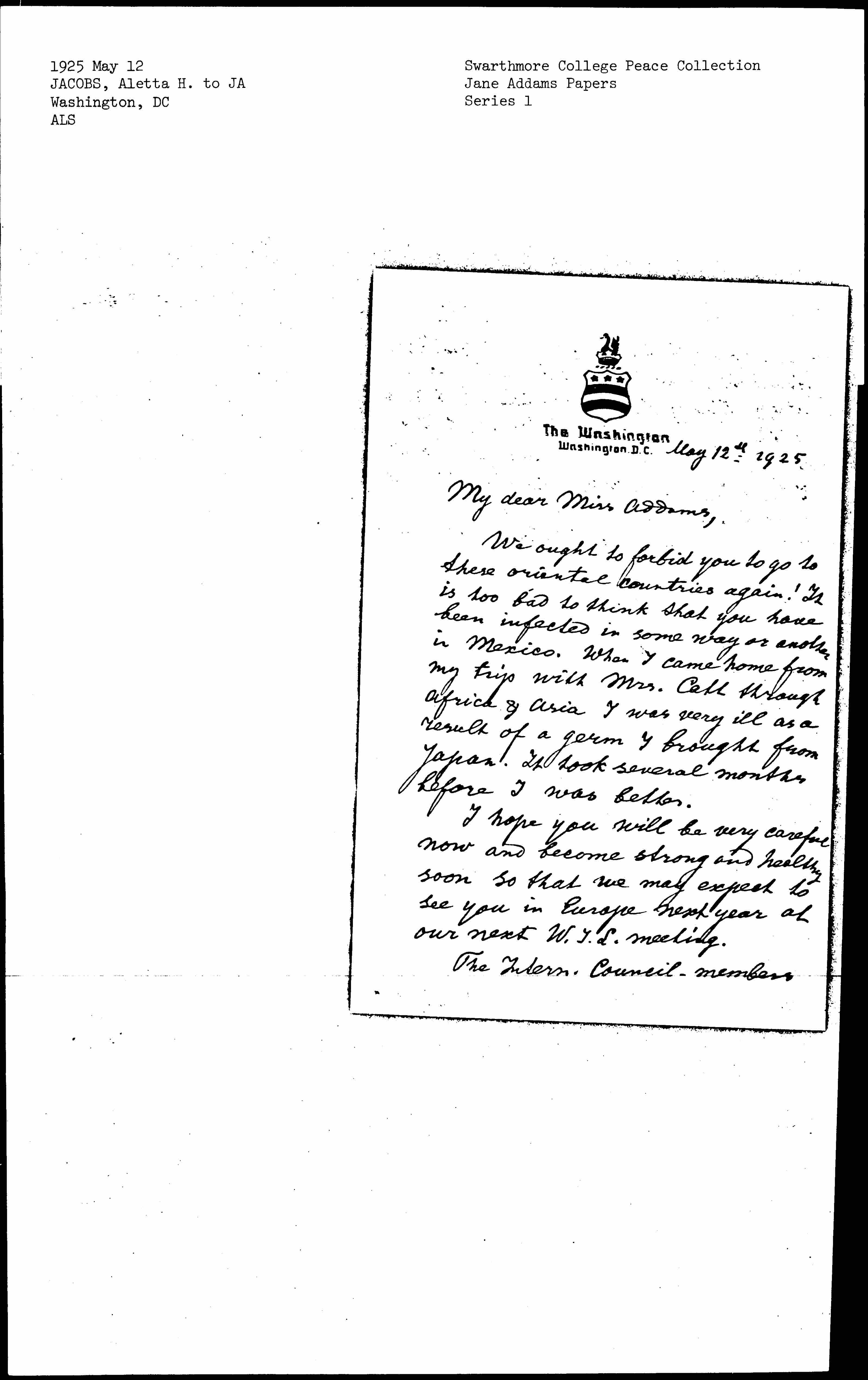 The Intern. Council members [page 2] have had a better reception in the White House than we have had last year. When Mr. & Mrs. Coolidge shook hands with me and Mrs. C. said "O, I am so glad to meet Dr. Jacobs personally." I should have liked to say, that I was the same Dr. J. of whom Mr. C. was so much afraid last year. But there was no time to say much, and that was perhaps good for me.
