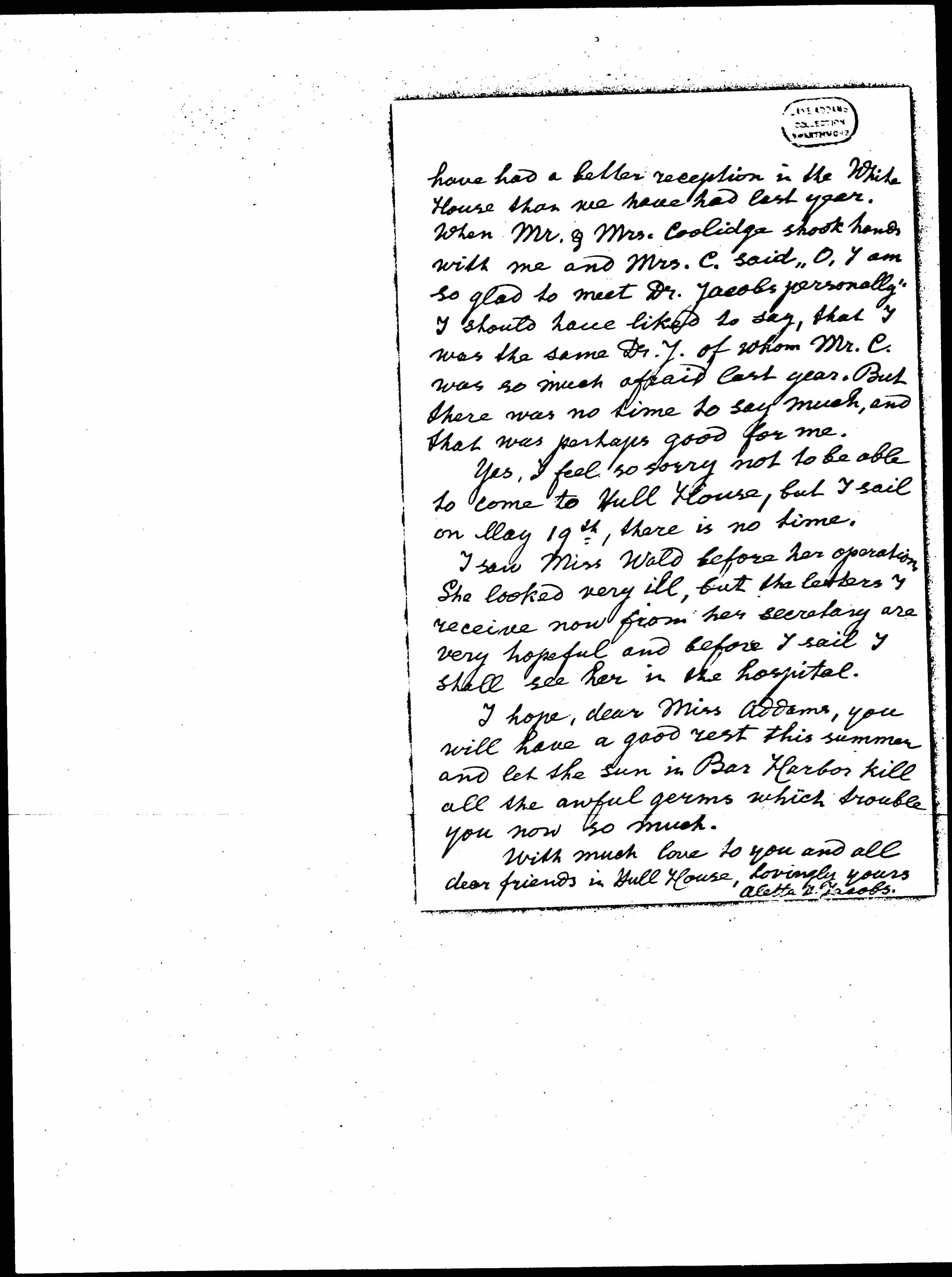 I hope, dear Miss Addams, you will have a good rest this summer and let the sun in Bar Harbor kill all the awful germs which trouble you now so much.