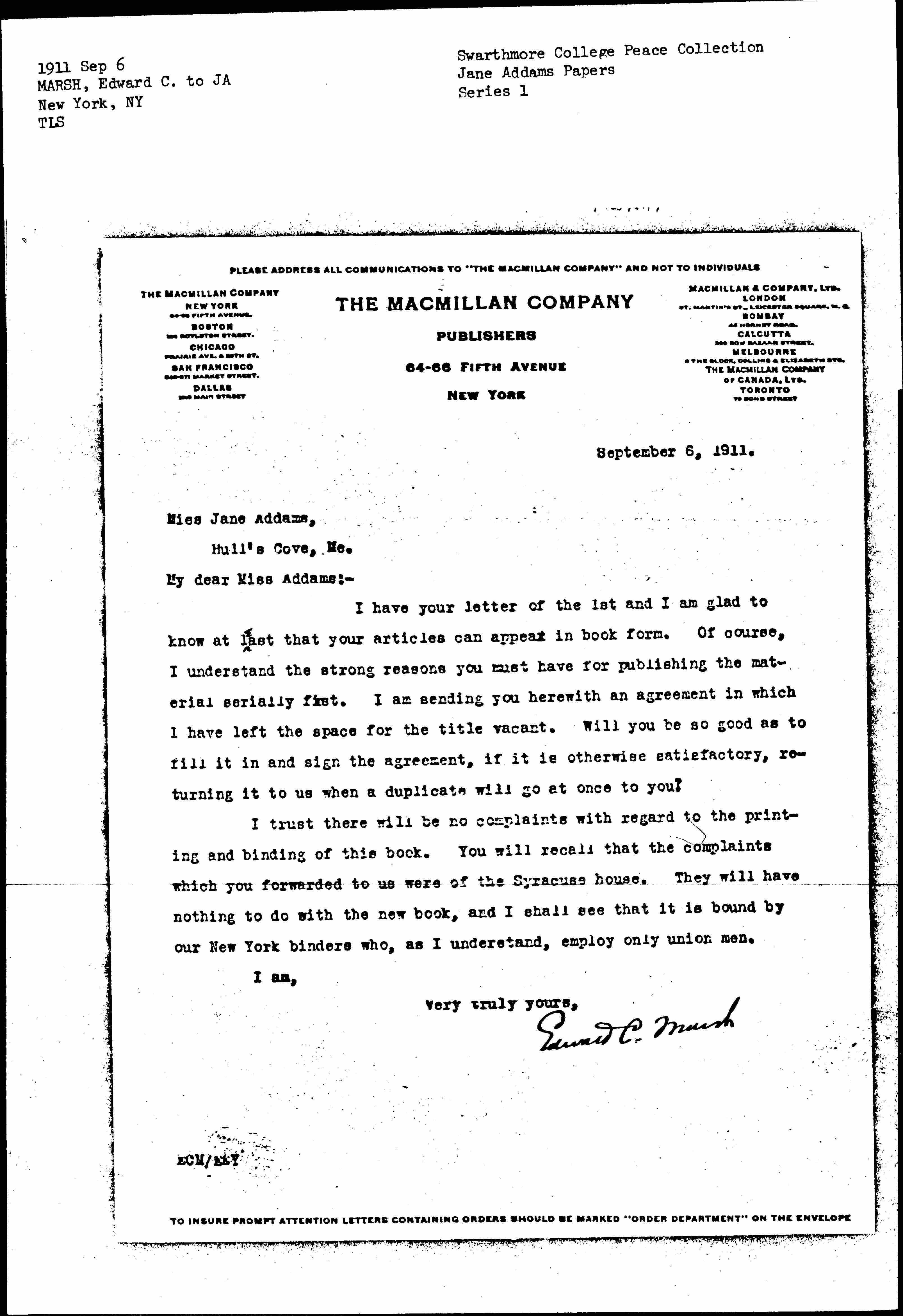 I have your letter of the 1st and I am glad to know at last that your articles can appear in book form. Of course, I understand the strong reasons you must have for publishing the material serially first. I am sending you herewith an agreement in which I have left the space for the title vacant. Will you be so good as to fill it in and sign the agreement, if it is otherwise satisfactory, returning it to us when a duplicate will go at once to you?