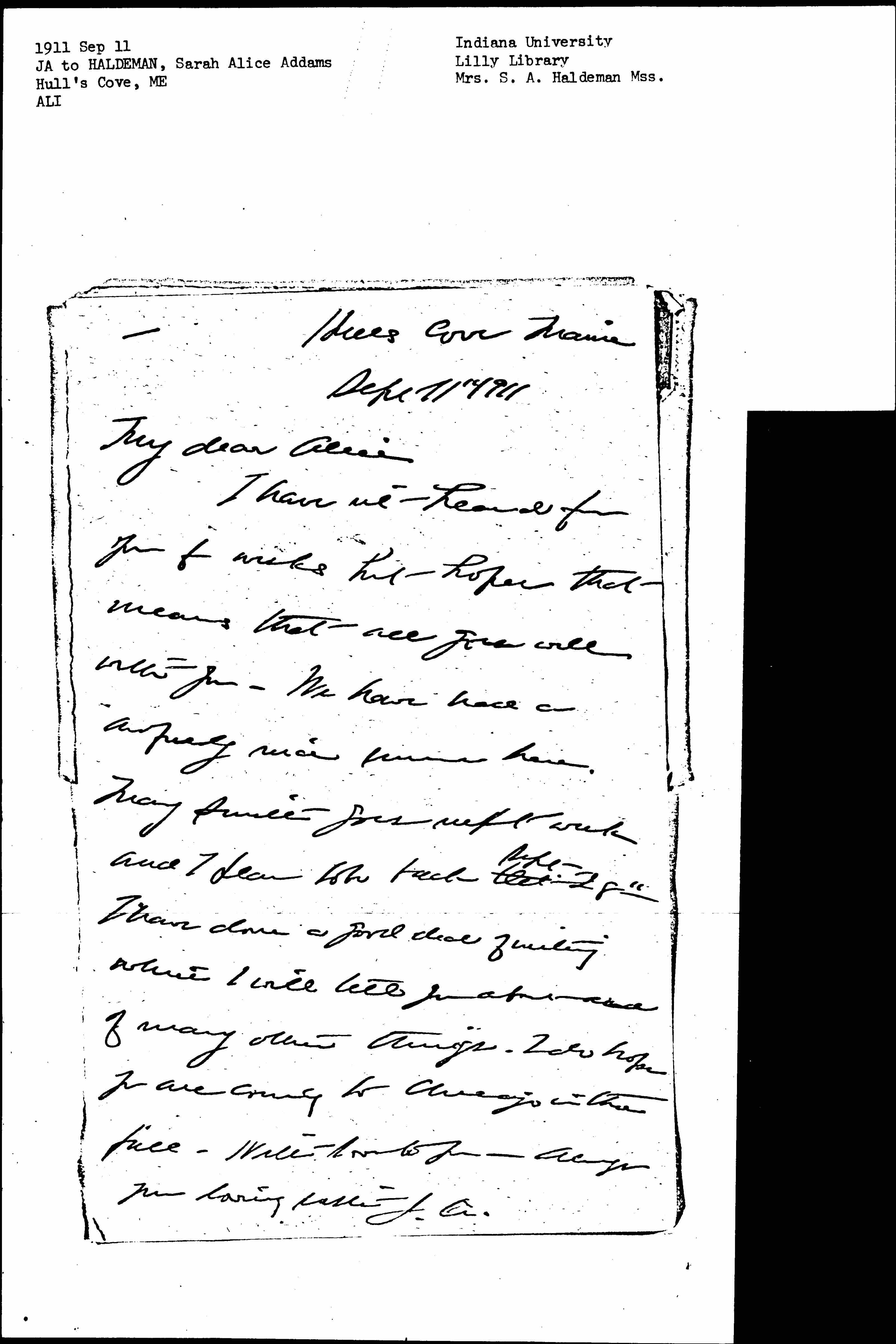 I haven't heard from you for weeks but hope that means that all goes well with you. We have had an awfully nice summer here. Mary Smith goes next week and I plan to be back Oct <Sept> 28" -- I have done a good deal of writing which I will tell you about and of many other things. I do hope you are coming to Chicago in the fall. With love to you -- Always your loving sister -- J. A.