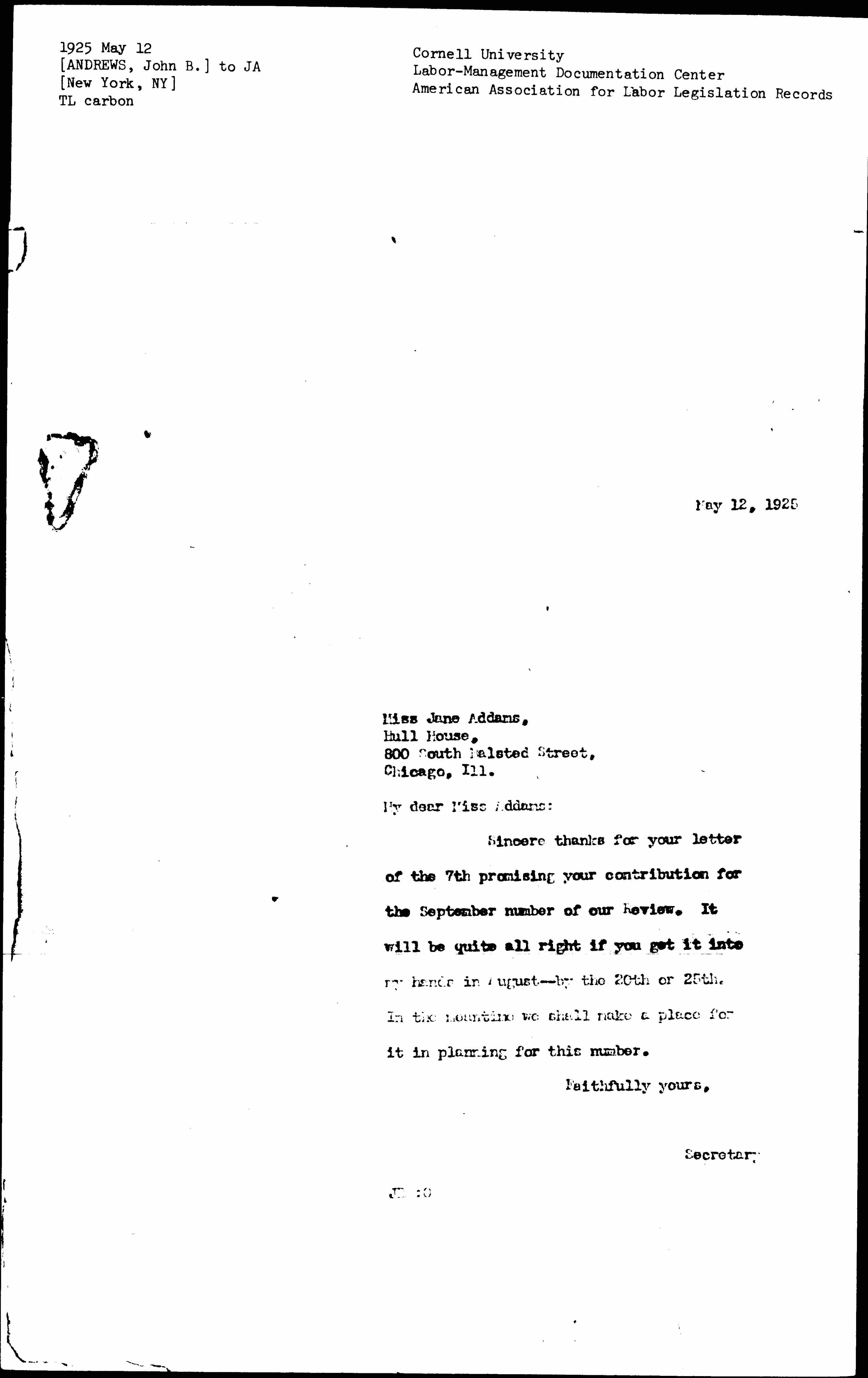 Sincere thanks for your letter of the 7th promising your contribution for the September number of our Review. It will be quite all right if you get it into my hands in August -- by the 20th or 25th. In the meantime we shall make a place for it in planning for this number.