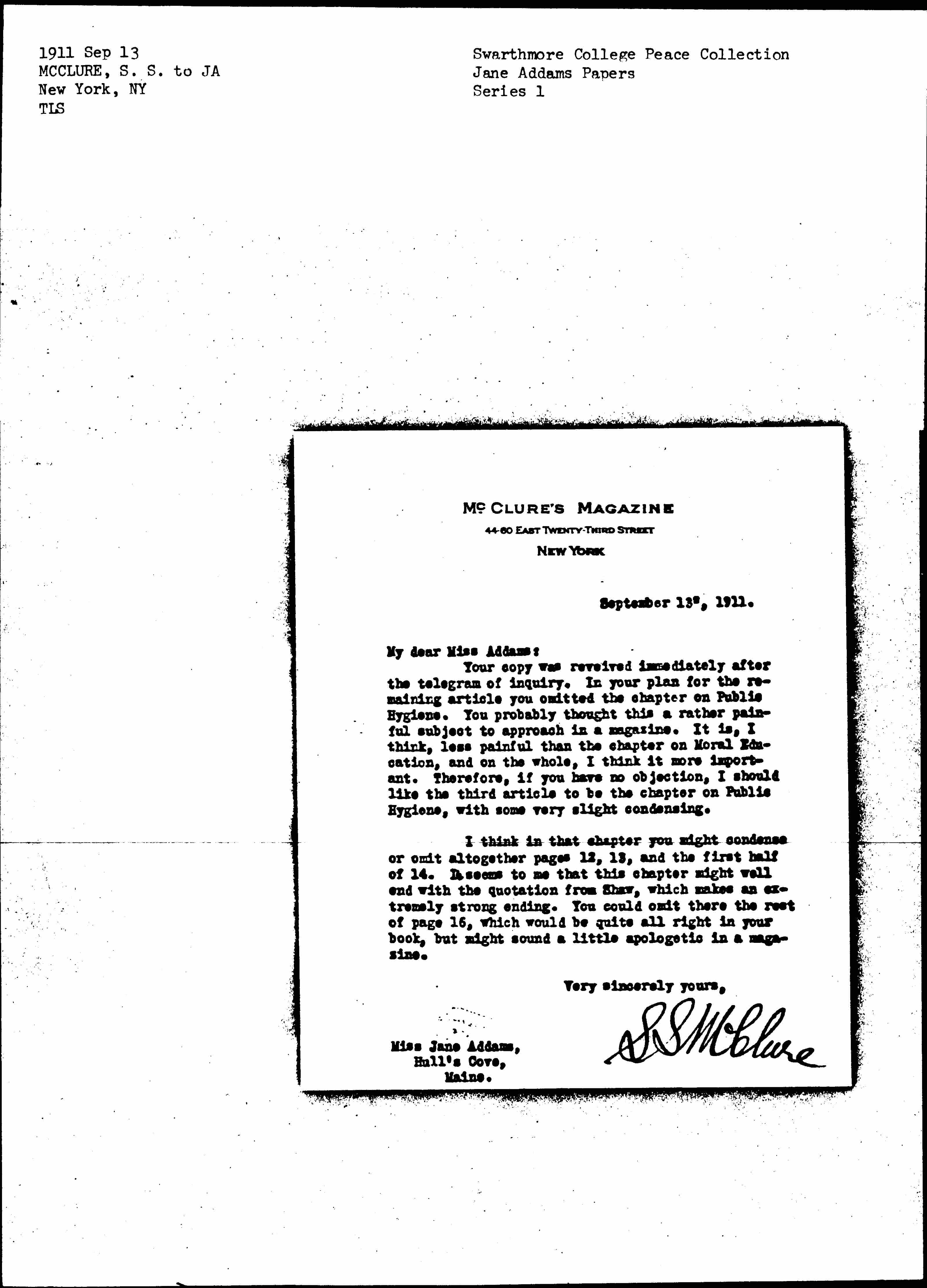 Your copy was received immediately after the telegram of inquiry. In your plan for the remaining article you omitted the chapter on Public Hygiene. You probably thought this a rather painful subject to approach in a magazine. It is, I think, less painful than the chapter on Moral Education, and on the whole, I think it more important. Therefore, if you have no objection, I should like the third article to be the chapter on Public Hygiene, with some very slight condensing.