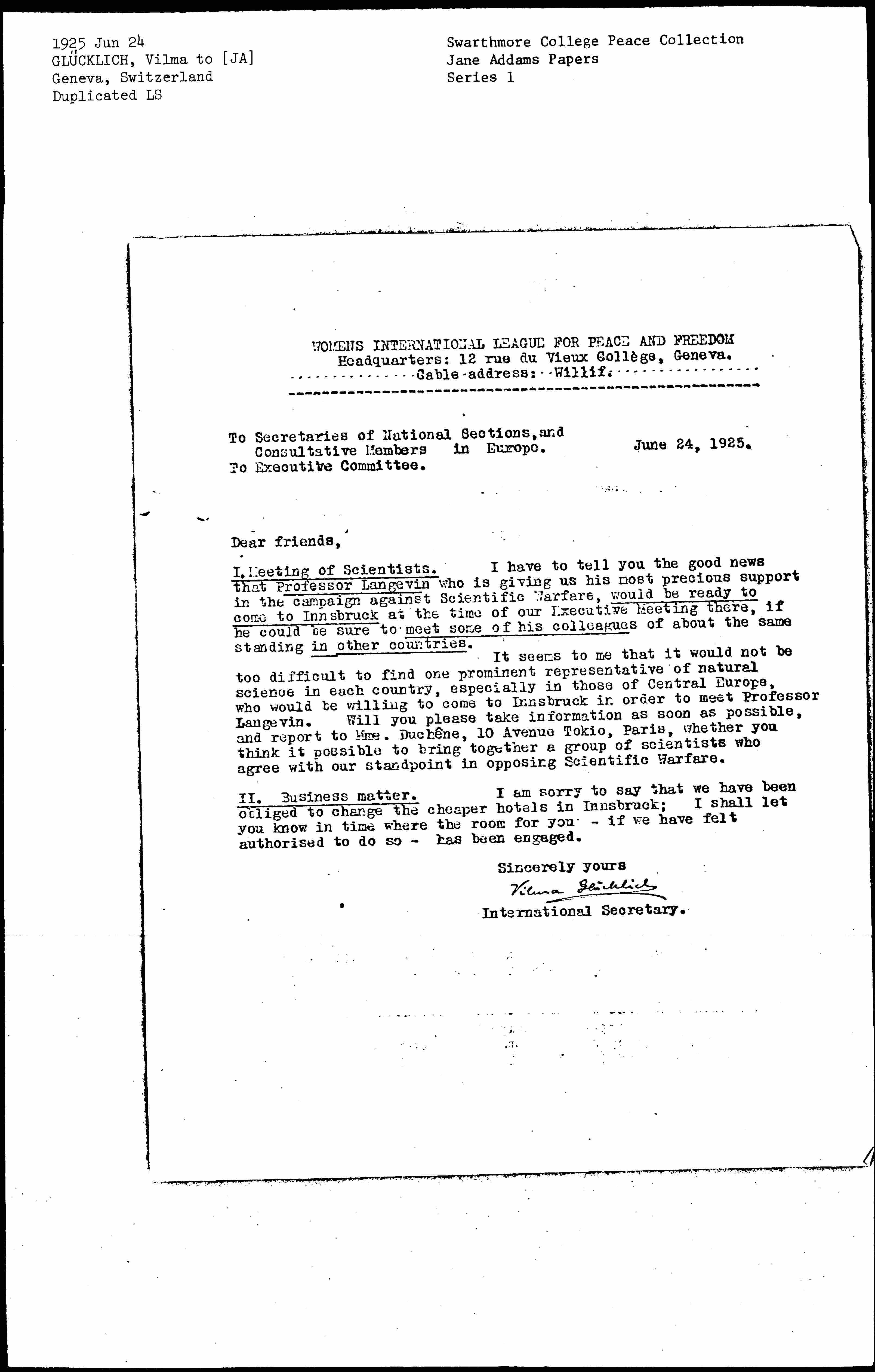 It seems to me that it would not be too difficult to find one prominent representative of natural science in each country, especially in those of Central Europe, who would be willing to come to Innsbruck in order to meet Professor Langevin. Will you please take information as soon as possible, and report to Mme. Duchêne, 10 Avenue [Tokyo], Paris, whether you think it possible to bring together a group of scientists who agree with our standpoint in opposing Scientific Warfare.