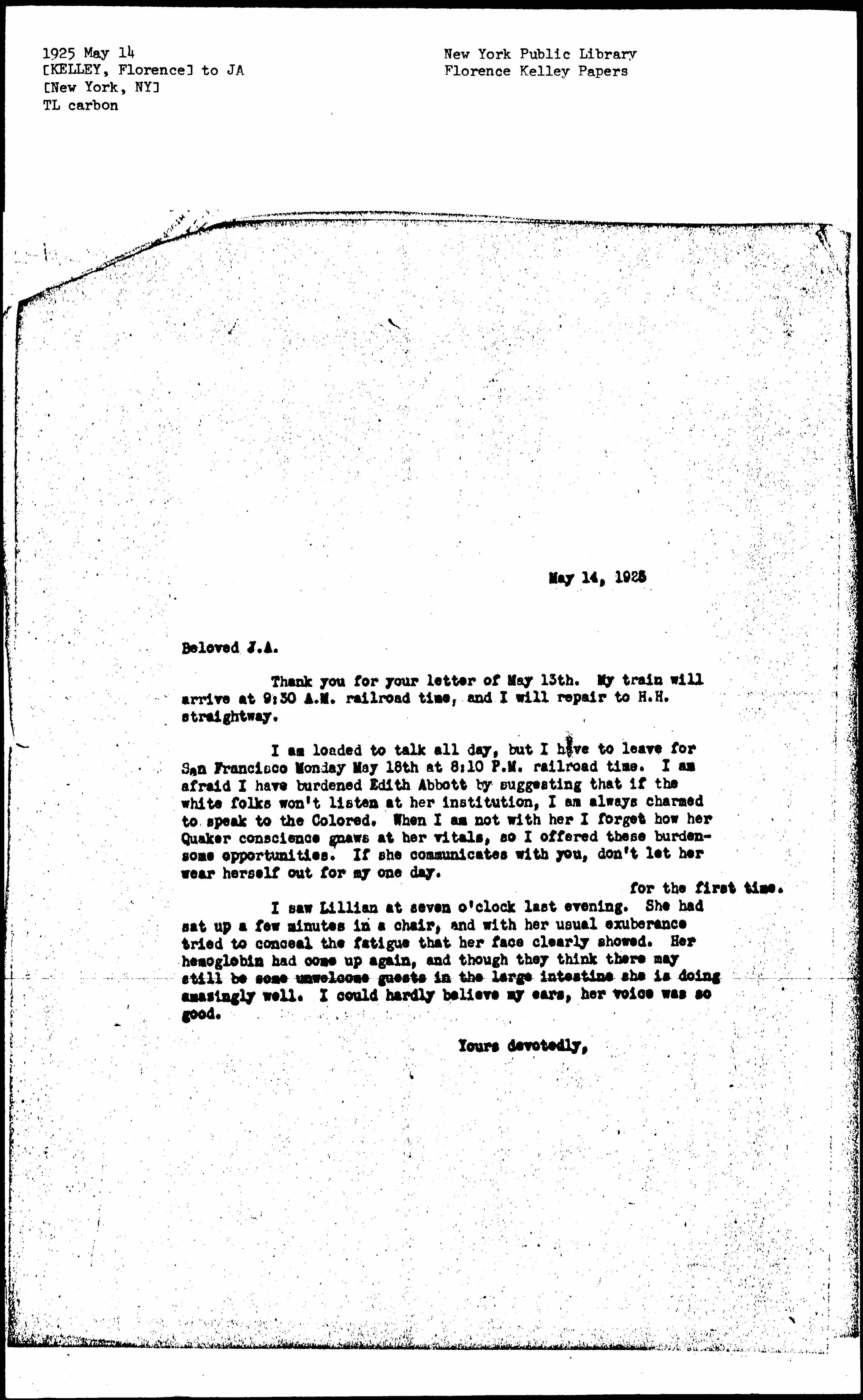 I am loaded to talk all day, but I have to leave for San Francisco Monday May 18th at 8:10 P.M. railroad time. I am afraid I have burdened Edith Abbott by suggesting that if the white folks won’t listen at her institution, I am always charmed to speak to the Colored. When I am not with her I forget how her Quaker conscience gnaws at her vitals, so I offered these burdensome opportunities. If she communicates with you, don’t let her wear herself out for my one day.