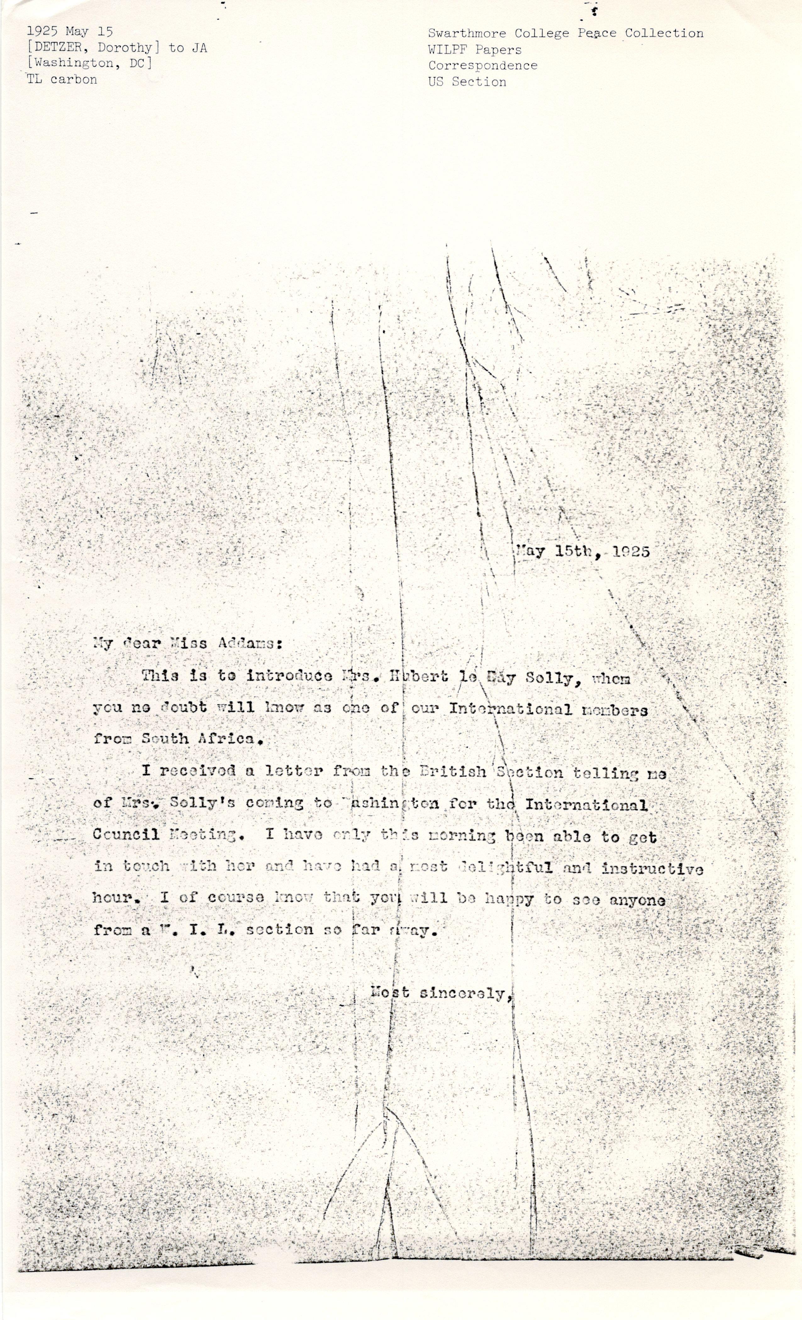 I received a letter from the British Section telling me of Mrs. Solly’s coming to Washington for the International Council Meeting. I have only this morning been able to get in touch with her and have had a most delightful and instructive hour. I of course know that you will be happy to see anyone from a W.I.L. section so far away.