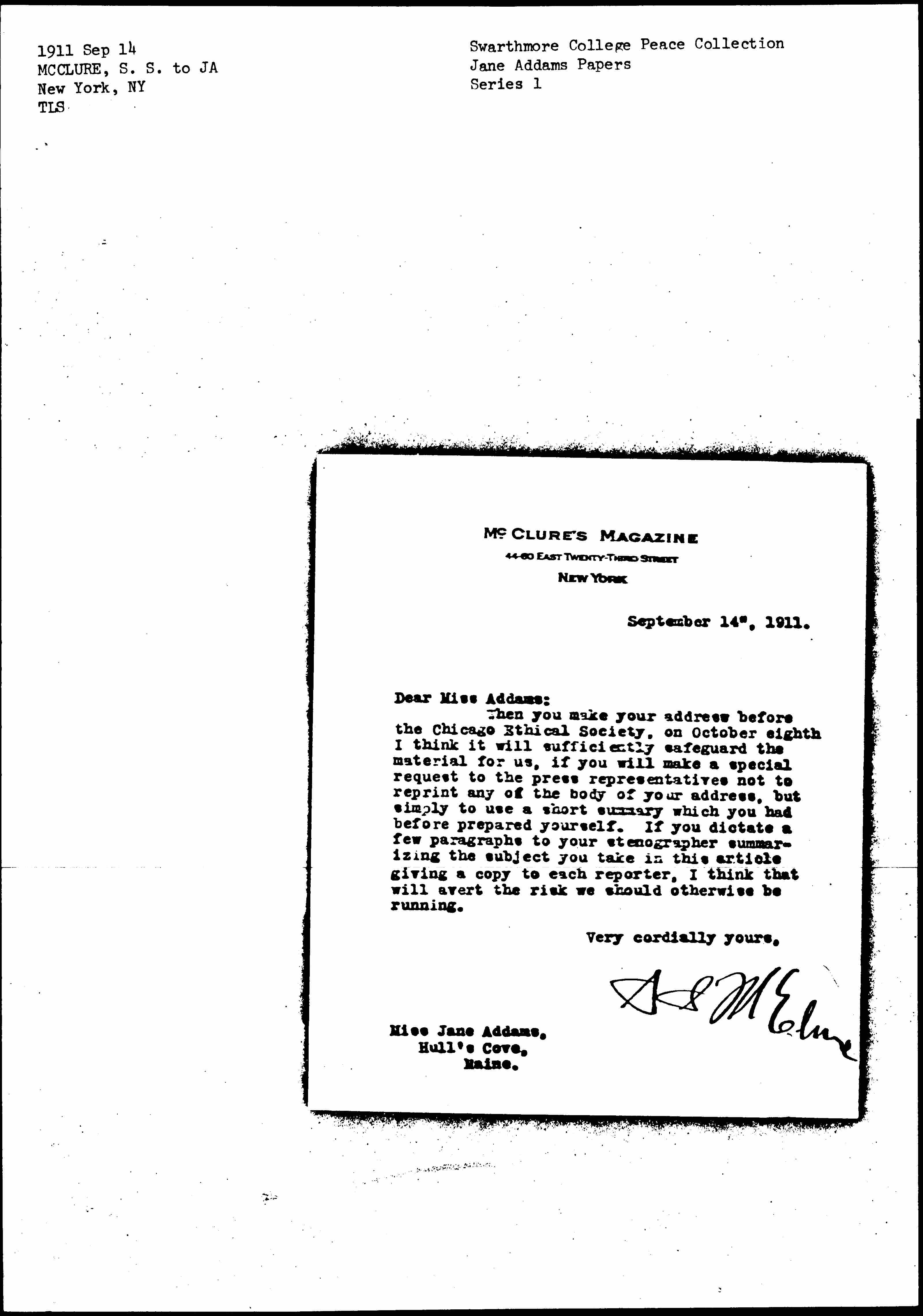 When you make your address before the Chicago Ethical Society, on October eighth I think it will sufficiently safeguard the material for us, if you will make a special request to the press representatives not to reprint any of the body of your address, but simply to use a short summary which you had before prepared yourself. If you dictate a few paragraphs to your stenographer summarizing the subject you take in this article giving a copy to each reporter, I think that will avert the risk we should otherwise be running.