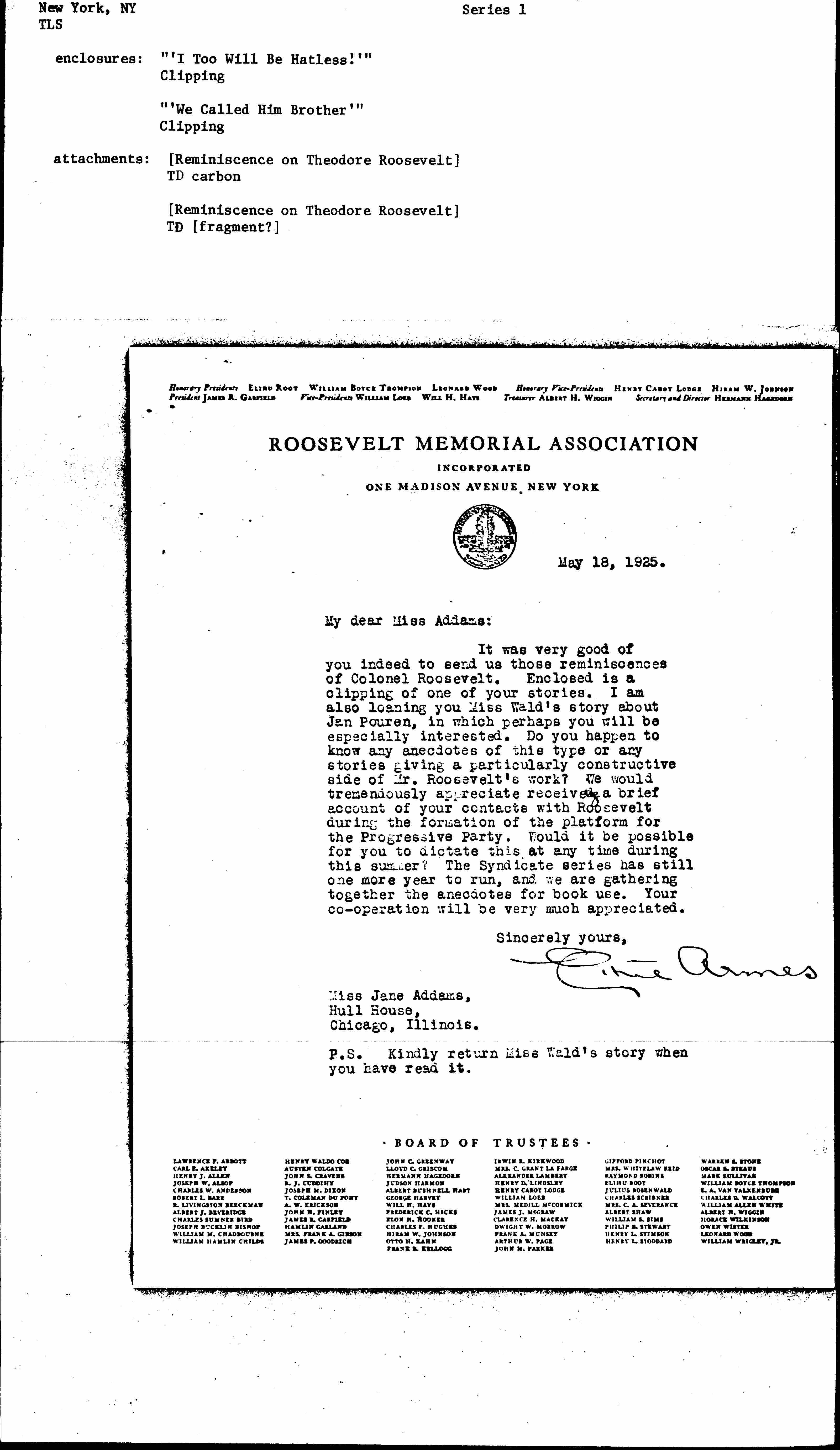 It was very good of you indeed to send us those reminiscences of Colonel Roosevelt. Enclosed is a clipping of one of your stories. I am also loaning you Miss Wald’s story about Jan Pouren, in which perhaps you will be especially interested. Do you happen to know any anecdotes of this type or any stories giving a particularly constructive side of Mr. Roosevelt’s work? We would tremendously appreciate [receiving] a brief account of your contacts with Roosevelt during the formation of the platform for the Progressive Party. Would it be possible for you to dictate this at any time during this summer? The Syndicate series has still one more year to run, and we are gathering together the anecdotes for book use. Your [cooperation] will be very much appreciated.