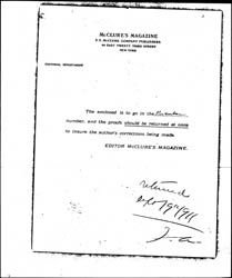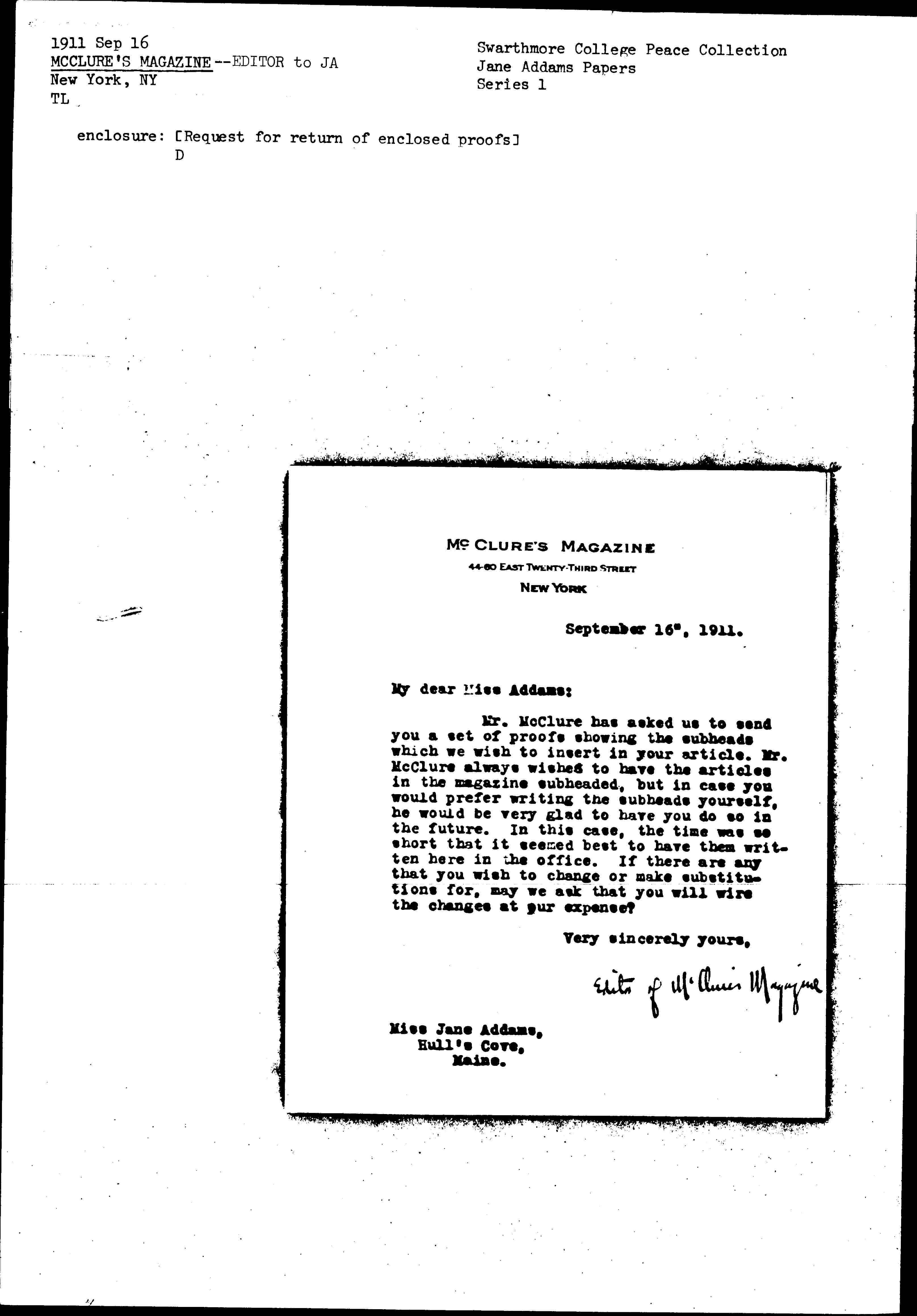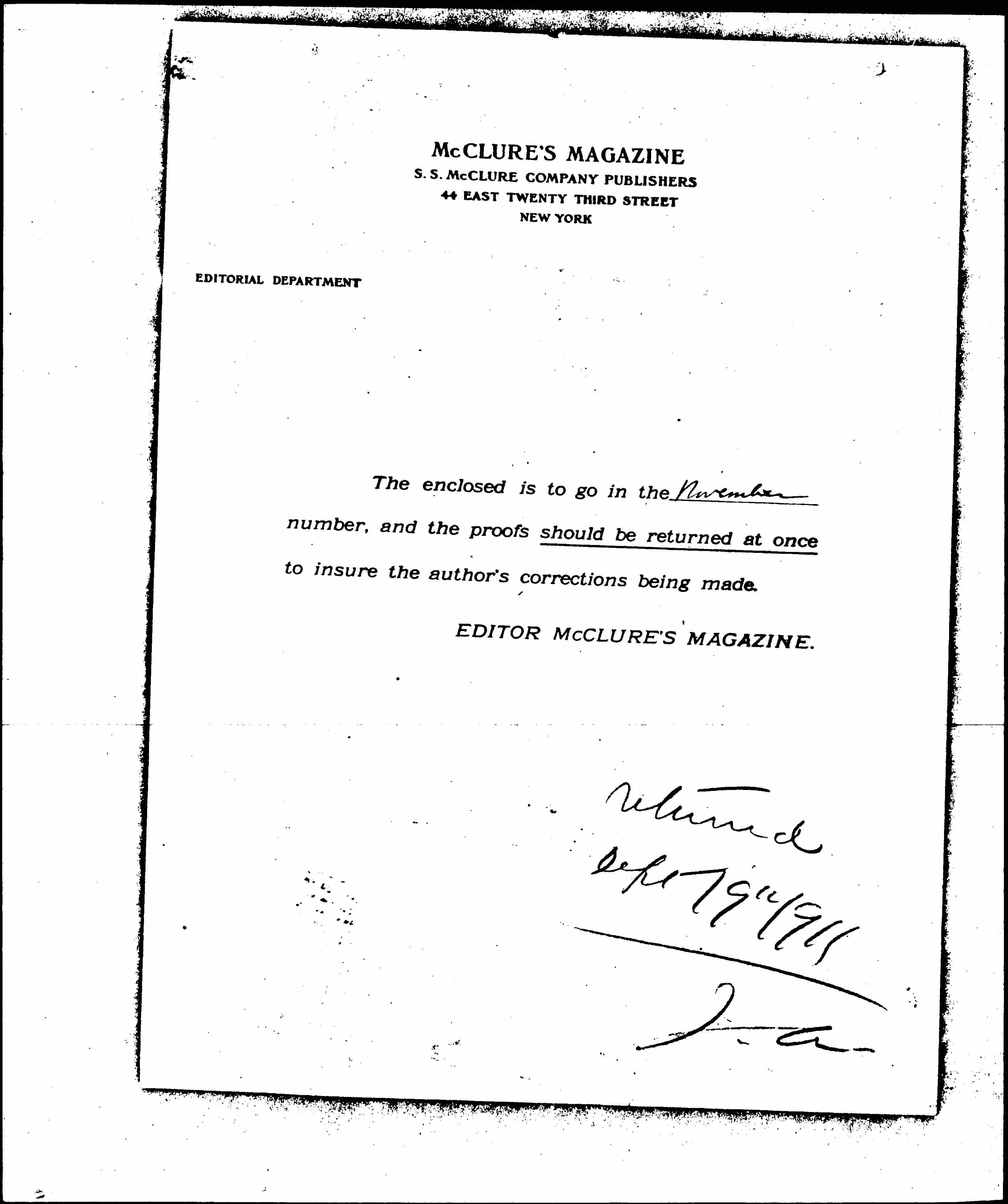 Mr. McClure has asked us to send you a set of proofs showing the subheads which we wish to insert in your article. Mr. McClure always wishes to have the articles in the magazine subheaded, but in case you would prefer writing the subheads yourself, he would be very glad to have you do so in the future. In this case, the time was so short that it seemed best to have them written here in the office. If there are any that you wish to change or make substitutions for, may we ask that you will wire the changes at our expense?
