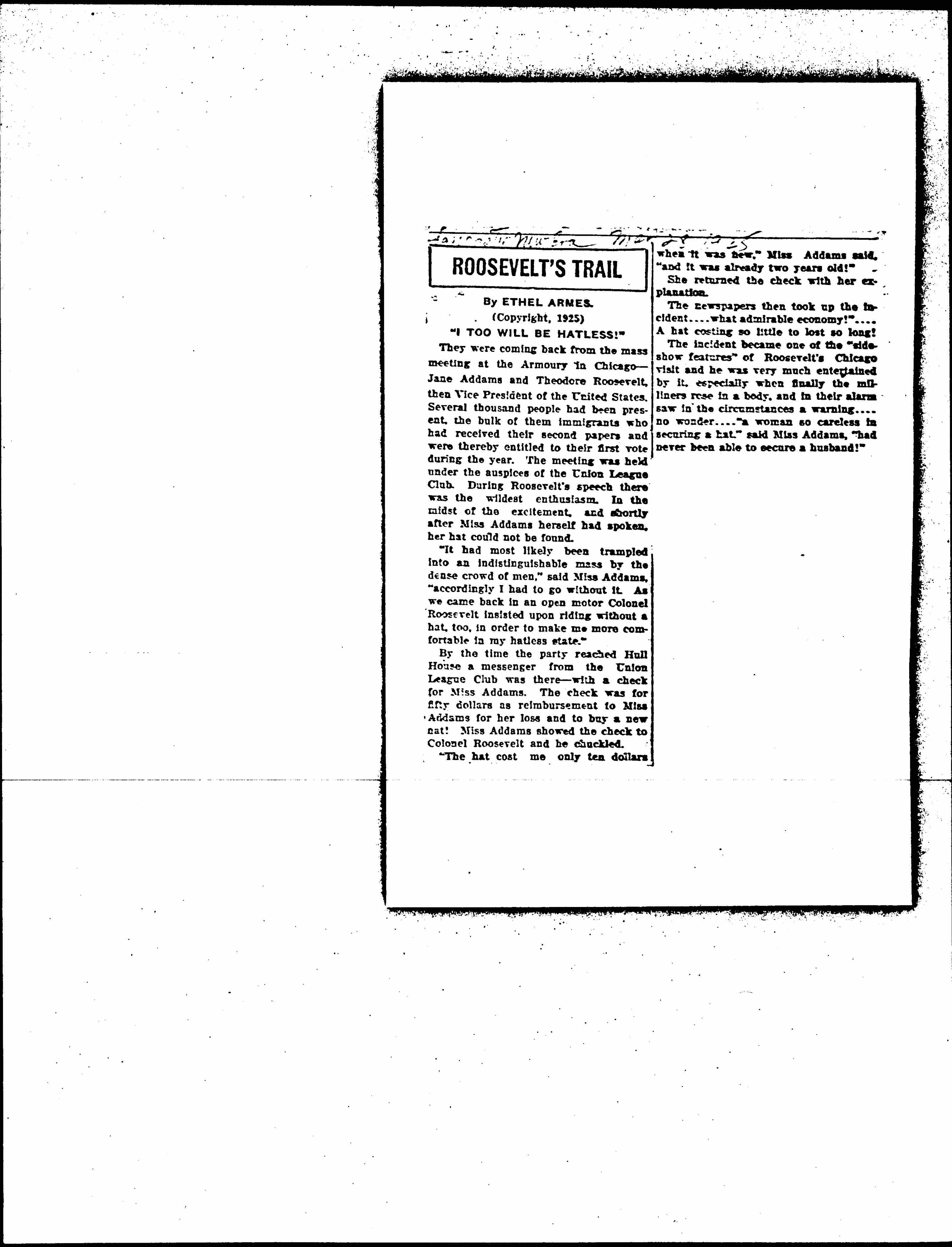 By the time the party reached Hull House a messenger from the Union League Club was there -- with a check for Miss Addams. The check was for fifty dollars as reimbursement to Miss Addams for her loss and to buy a new hat! Miss Addams showed the check to Colonel Roosevelt and he chuckled.