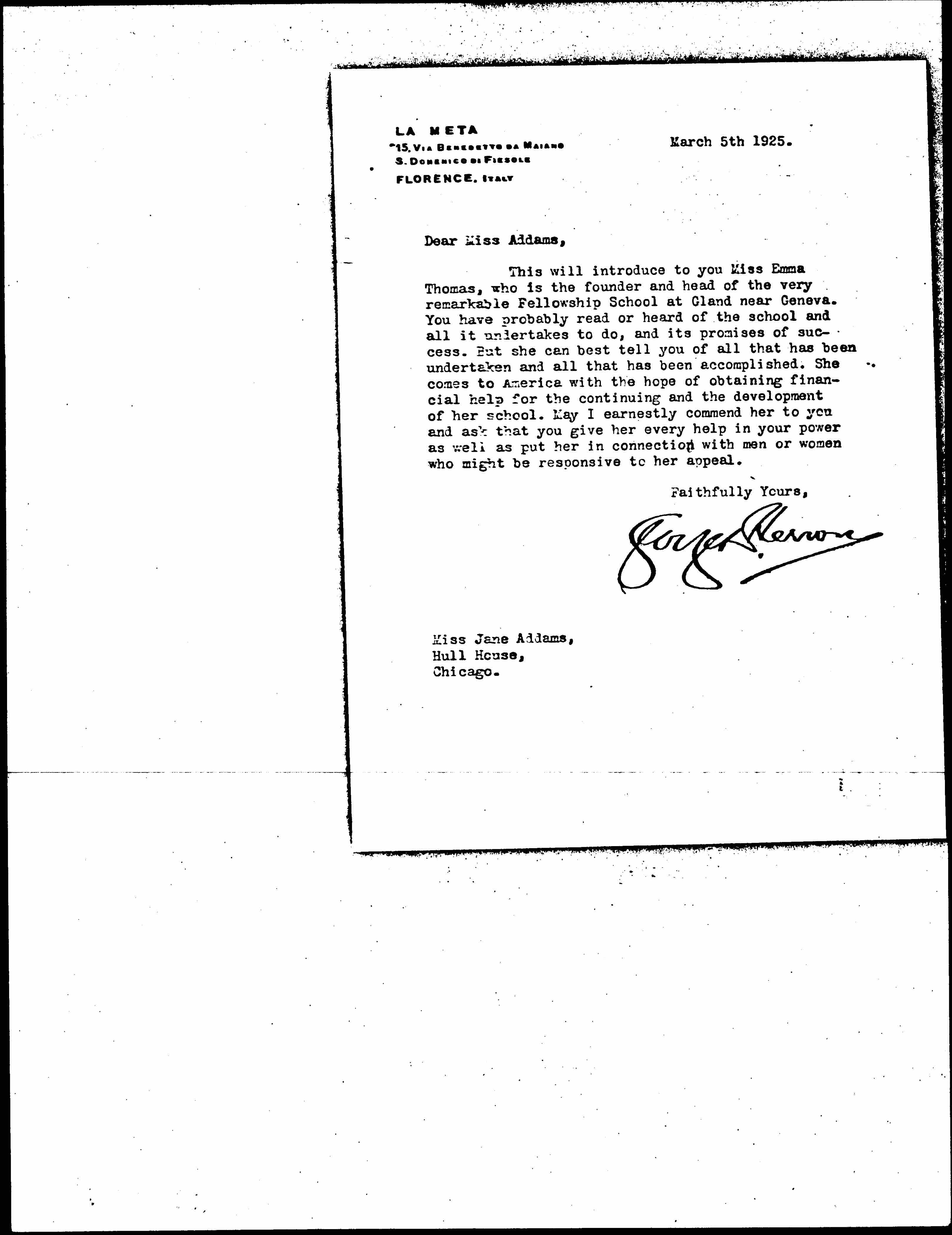 This will introduce to you Miss Emma Thomas, who is the founder and head of the very remarkable Fellowship School at Gland near Geneva. You have probably read or heard of the school and all it undertakes to do, and its promises of success. But she can best tell you of all that has been undertaken and all that has been accomplished. She comes to America with the hope of obtaining financial help for the continuing and the development of her school. May I earnestly commend her to you and ask that you give her every help in your power as well as put her in connection with men or women who might be responsive to her appeal.