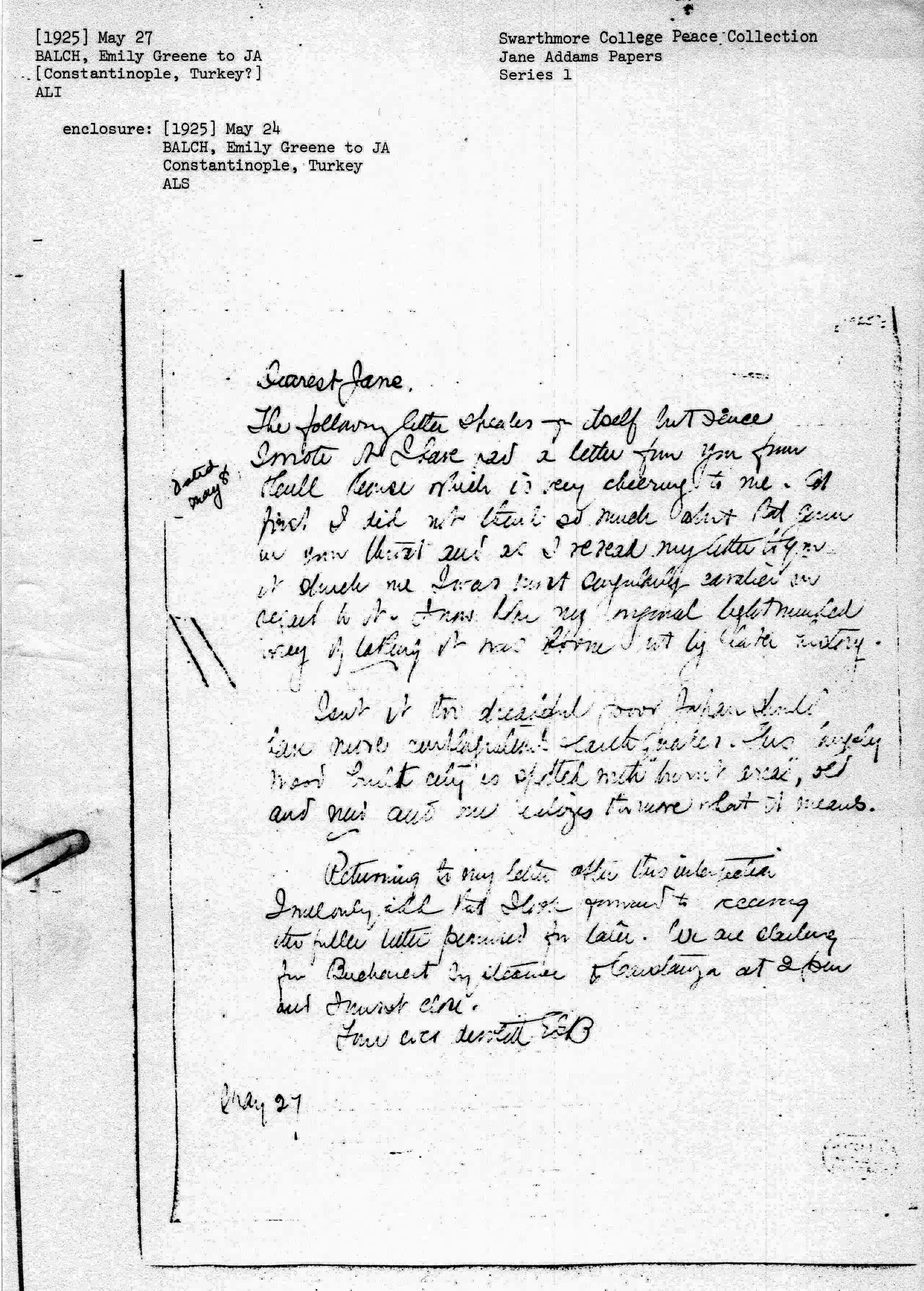The following letter speaks for itself but since I wrote it I have had a letter from you from Hull House which is very cheering to me. At first I did not think so much about that given your sore throat and as I reread my letter to you it struck me I was most confoundingly cavalier in regard to it. It was like my original lightminded way of taking it was borne out by later history.