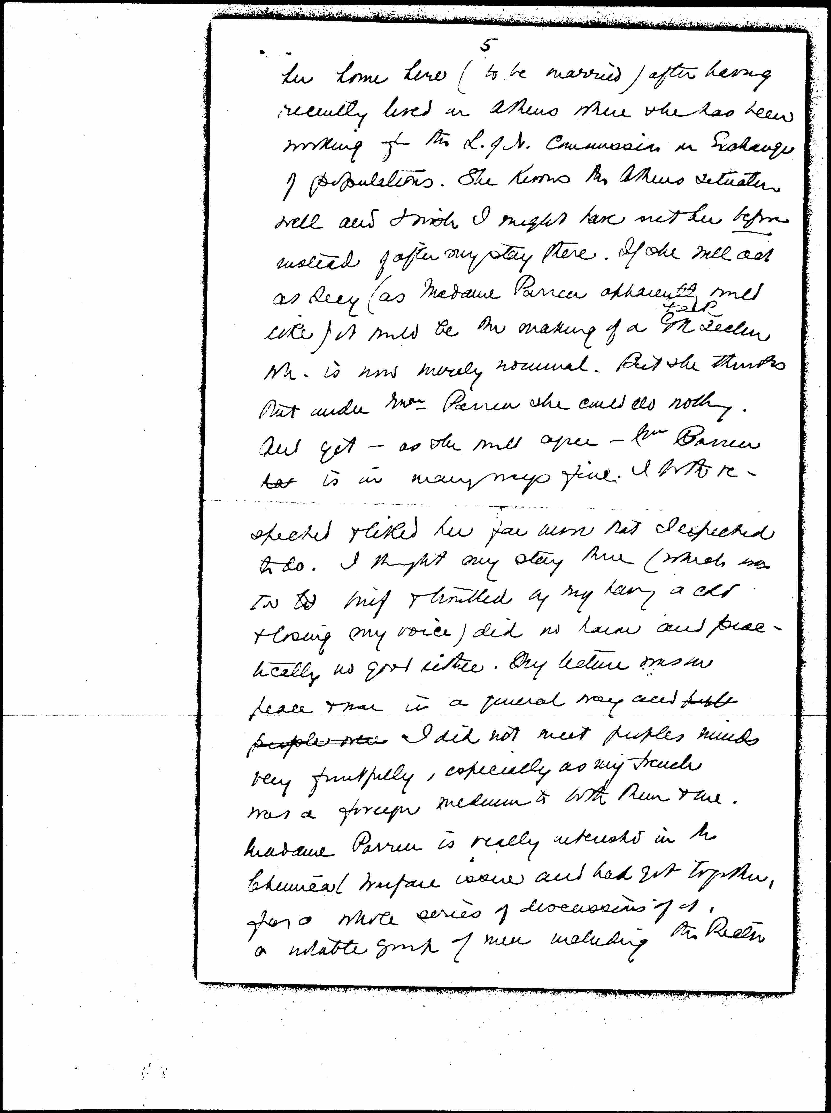 Alexandra Joannides, whom I knew well in Geneva where she is was a postgrad student, is now here after at [page 5] her home here (to be married) after having recently lived in Athens where she has been working for the L. of N. Commission on Exchange of populations. She knows the Athens situation well and I wish I might have met her before instead of after my stay there. If she will act as Secy (as Madame Parren apparently would like) it would be the making of a ↑Greek↓ section wh. is now merely nominal. But she thinks that under Mme Parren she could do nothing. And yet -- as she will agree -- Mme Parren has is in many ways fine. I both respected & liked her far more that I expected to do. I thought my stay there (which was too to brief & troubled by my having a cold & losing my voice) did no harm and practically no good either. My lecture was on peace & war in a general way and peple people were I did not meet peoples minds very fruitfully, especially as my French was a foreign medium to both them & me. Madame Parren is really interested in the Chemical Warfare issue and had got together, for a whole series of discussions of it, a notable group of men including the Rector [page 6] of the University and the Head of the Chemical Service of the Greek Navy Dept. These gentlemen also met with me but of course I have to say that I don't believe you can abolish chemical warfare except by abolishing war.