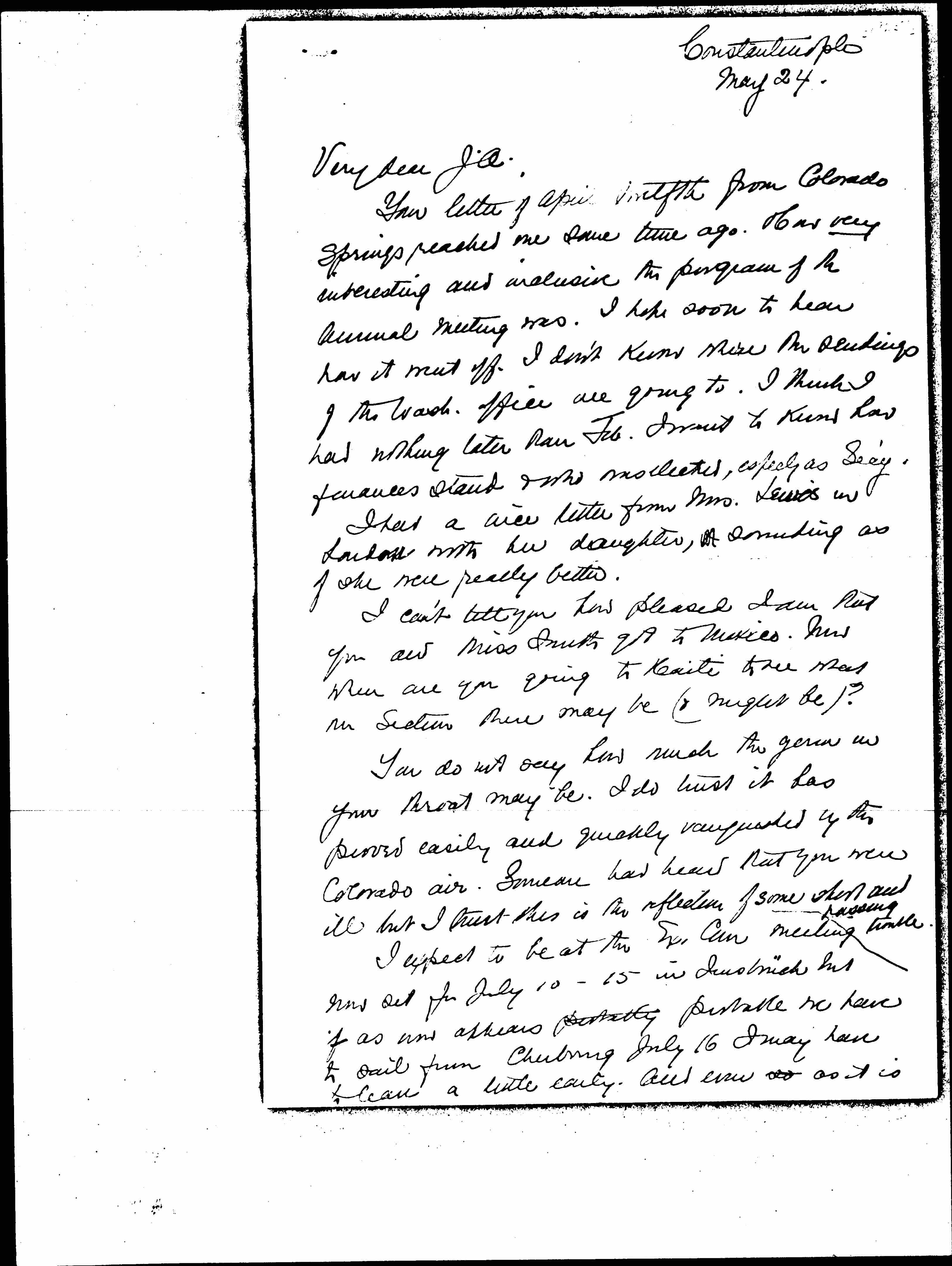Your letter of April twelfth from Colorado Springs reached me some time ago. How very interesting and inclusive the program of the Annual meeting was. I hope soon to hear how it went off. I don’t know where the sendings of the Wash. office are going to. I think I had nothing later than Feb. I want to know how finances stand & who was elected, [especially] as Sec'y.
