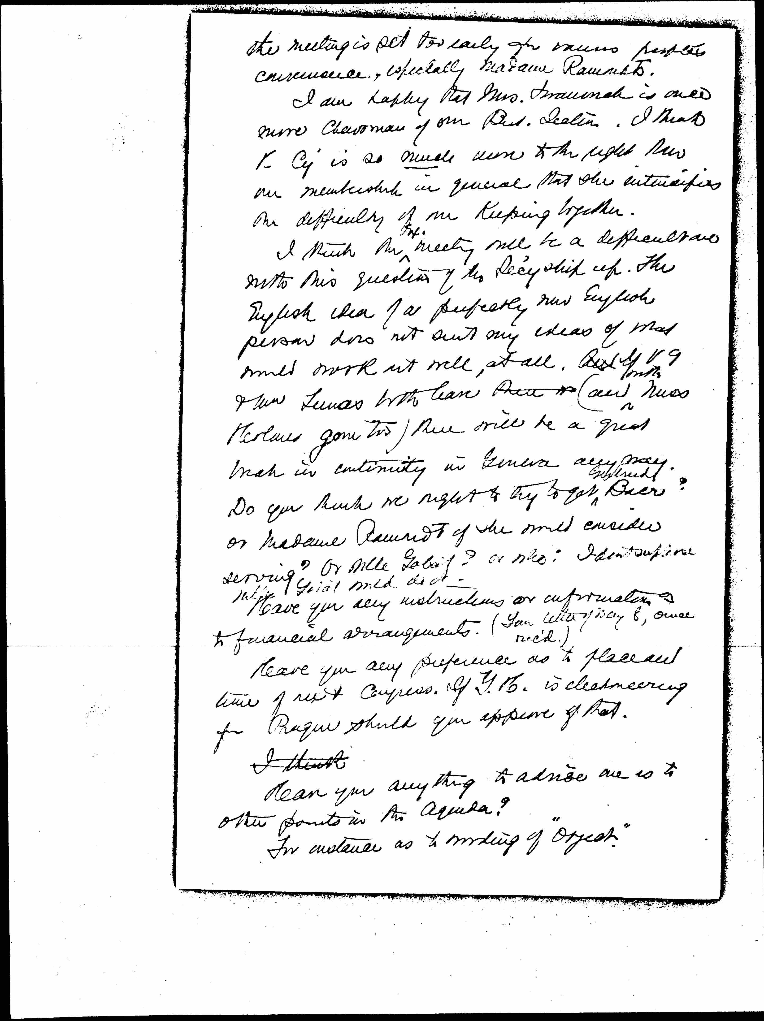 I think the ↑Ex.↓ meeting will be a difficult one with this question of who the Sec'yship up. The English idea of a perfectly new English person does not suit my ideas of what would work out well, at all. And If ↑both↓ VG & Mr Tunas both leave then w (and with Miss Holmes gone too) there will be a great break in continuity in Geneva anyway. Do you think me right to try to get ↑Gertrud↓ Baer? or Madame Ramondt if she would consider serving? Or Mlle. Gobat? or who? I don't suppose Mlle Gobat would do it.