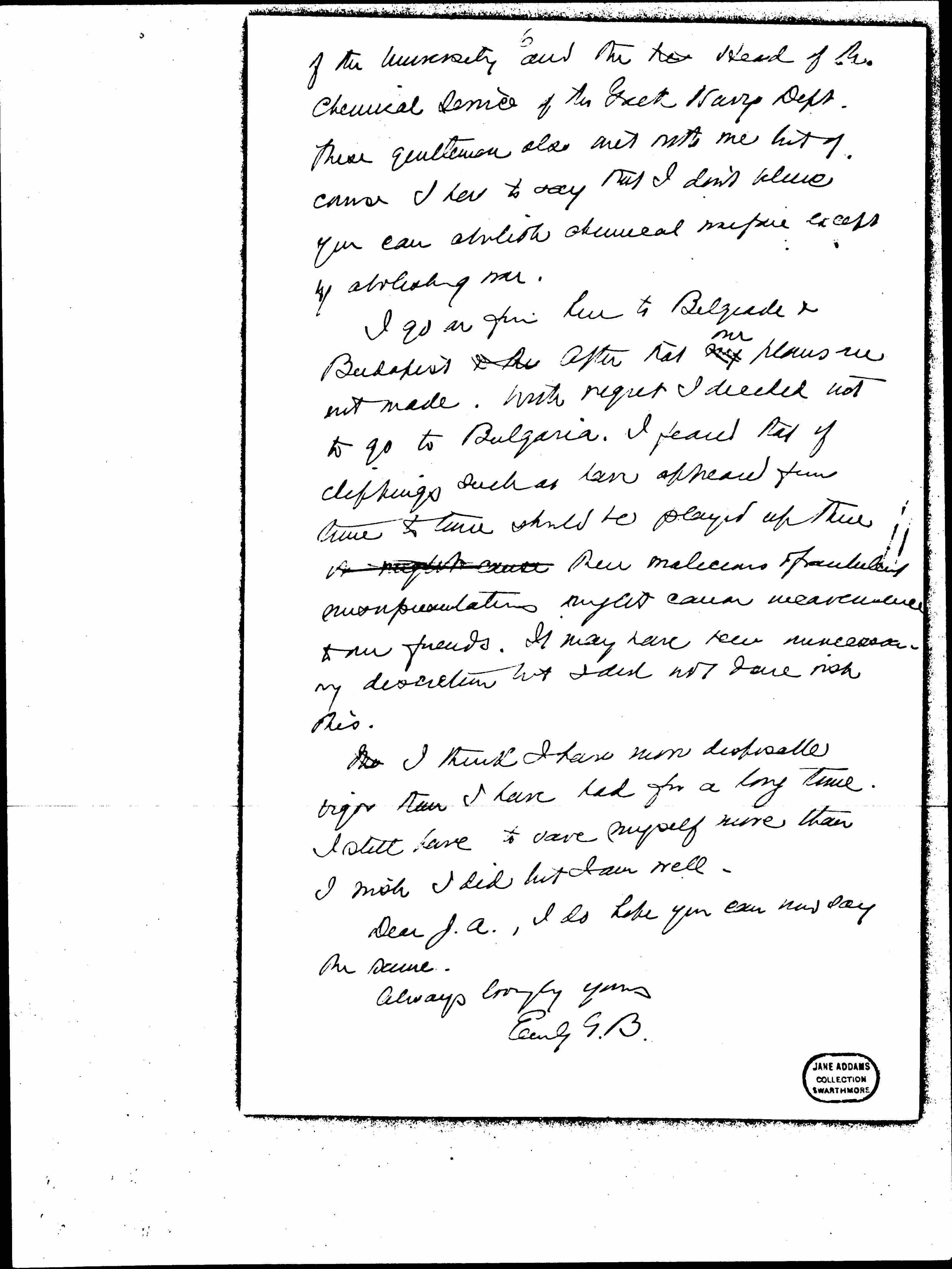 I go on from here to Belgrade & Budapest & the After that my ↑our↓ plans are not made. With regret I decided not to go to Bulgaria. I feared that if clippings such as have appeared from time to time should be played up there it might cause then malicious & fraudulent misrepresentations might cause inconvenience to our friends. It may have been unnecessary discretion but I did not dare risk this.