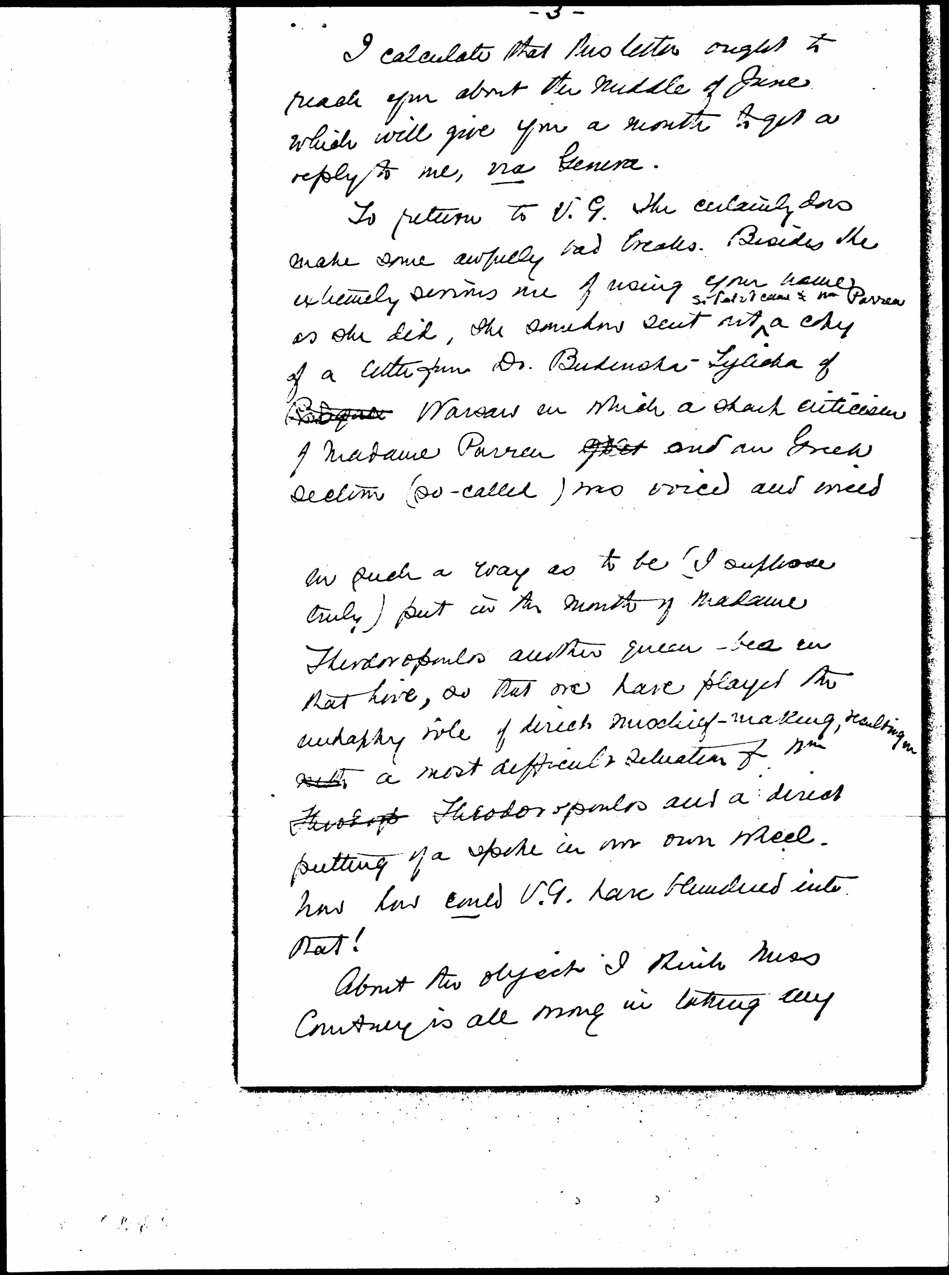 To return to V. G. She certainly does make some awfully bad breaks. Besides the extremely serious one of using your name as she did, she somehow sent out ↑so that it came to M. Parren↓ a copy of a letter from Dr. [Budzińska]-Tylicka of Prague Warsaw in which a sharp criticism of Madame Parren [past] and our Greek section (so-called) was voiced and cried in such a way as to be (I suppose truly) put in the mouth of Madame Theodop Theodoropoulos another queen-bee in that hive, so that we have played the unhappy role of direct mischief-making, resulting in with a most difficult situation for Mm. Theodoropoulos and a direct putting of a spike in our own wheel. Now how could V.G. have blundered into that!