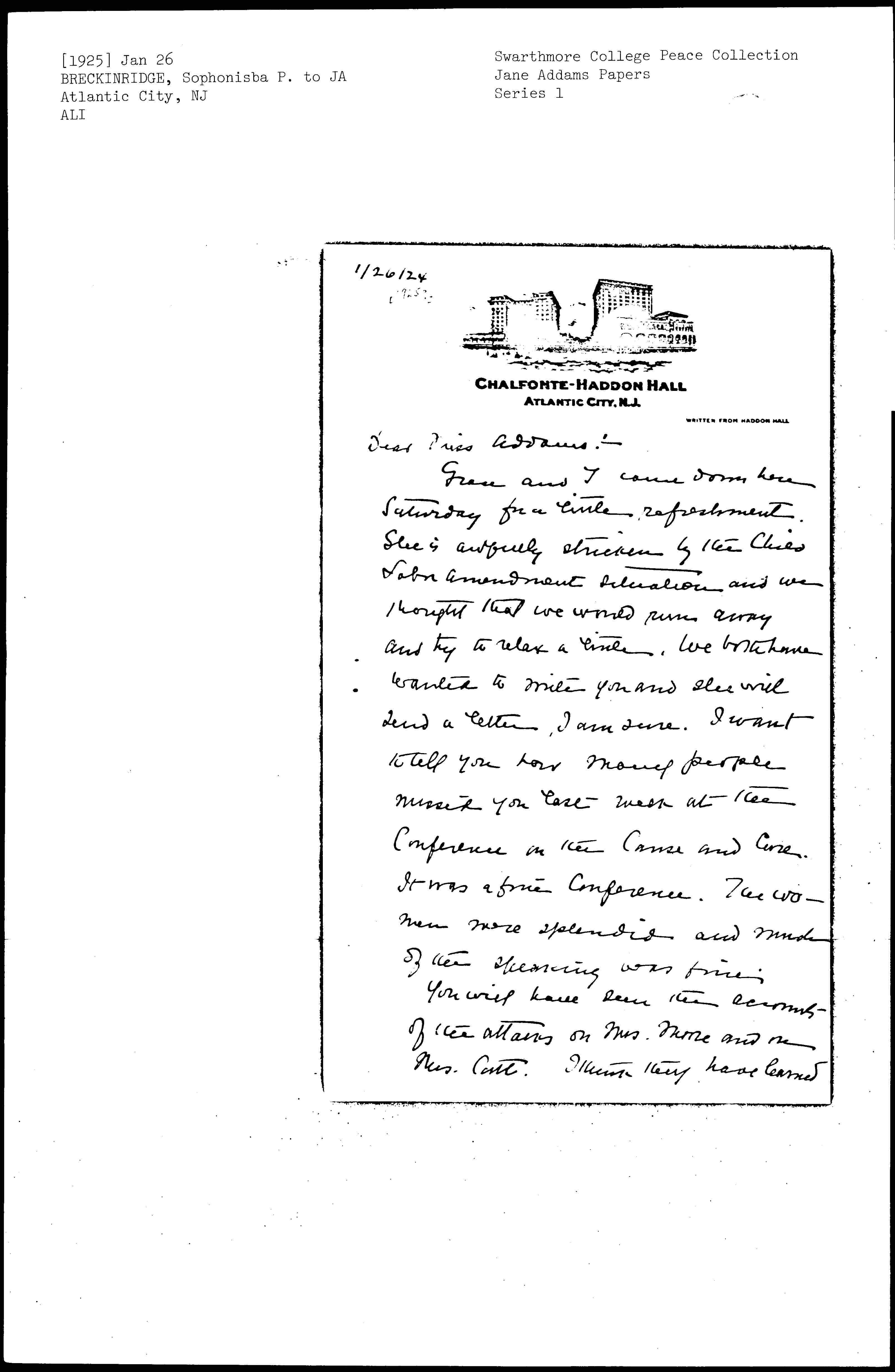 Grace and I came down here Saturday for a little refreshment. She is awfully stricken by the Child Labor Amendment situation and we thought that we would run away and try to relax a little. We both have wanted to write you and she will send a letter, I am sure. I want to tell you how many people missed you last week at the Conference on the Cause and Cure. It was a fine Conference. The women were splendid and much of the speaking was fine.