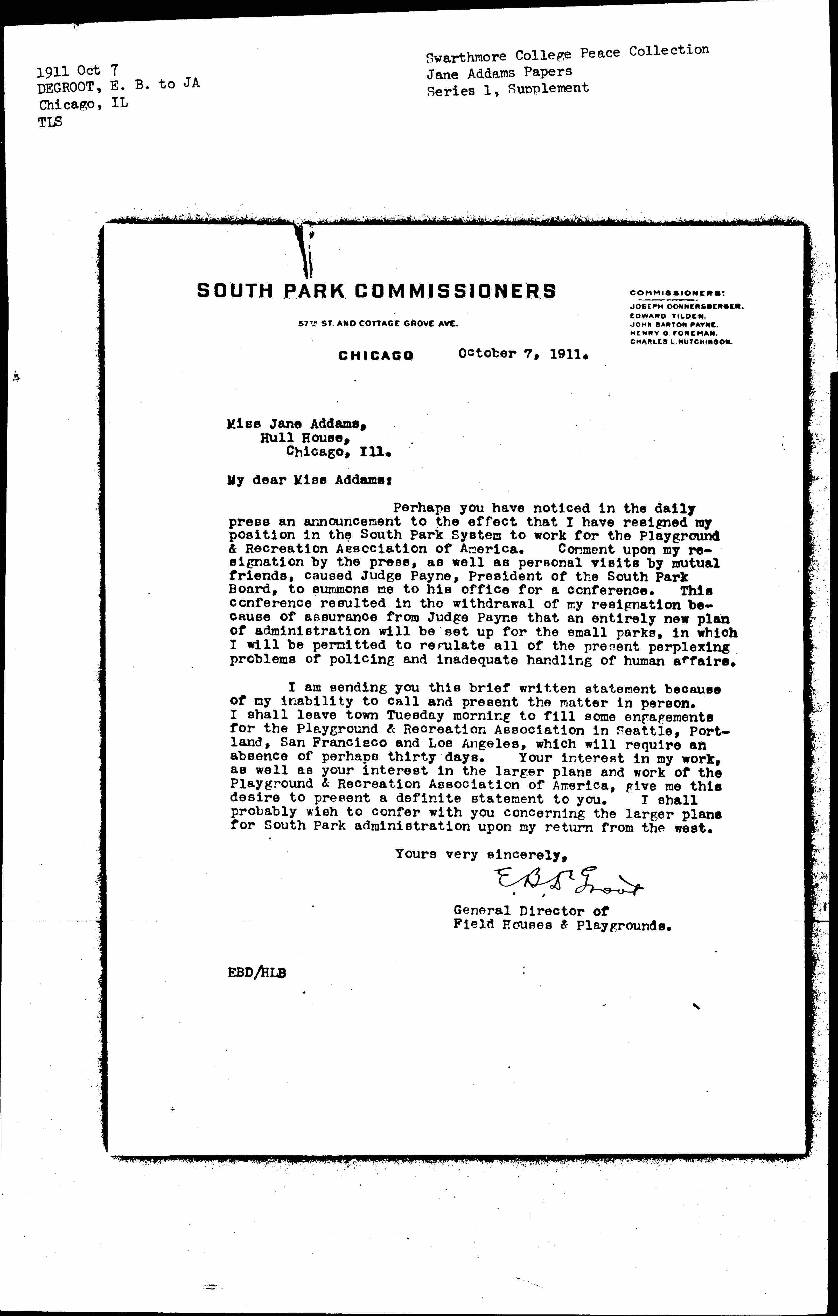 Perhaps you have noticed in the daily press an announcement to the effect that I have resigned my position in the South Park System to work for the Playground & Recreation Association of America. Comment upon my resignation by the press, as well as personal visits by mutual friends, caused Judge Payne, President of the South Park Board, to summons me to his office for a conference. This conference resulted in the withdrawal of my resignation because of assurance from Judge Payne that an entirely new plan of administration will be set up for the small parks, in which I will be permitted to regulate all of the present perplexing problems of policing and inadequate handling of human affairs.