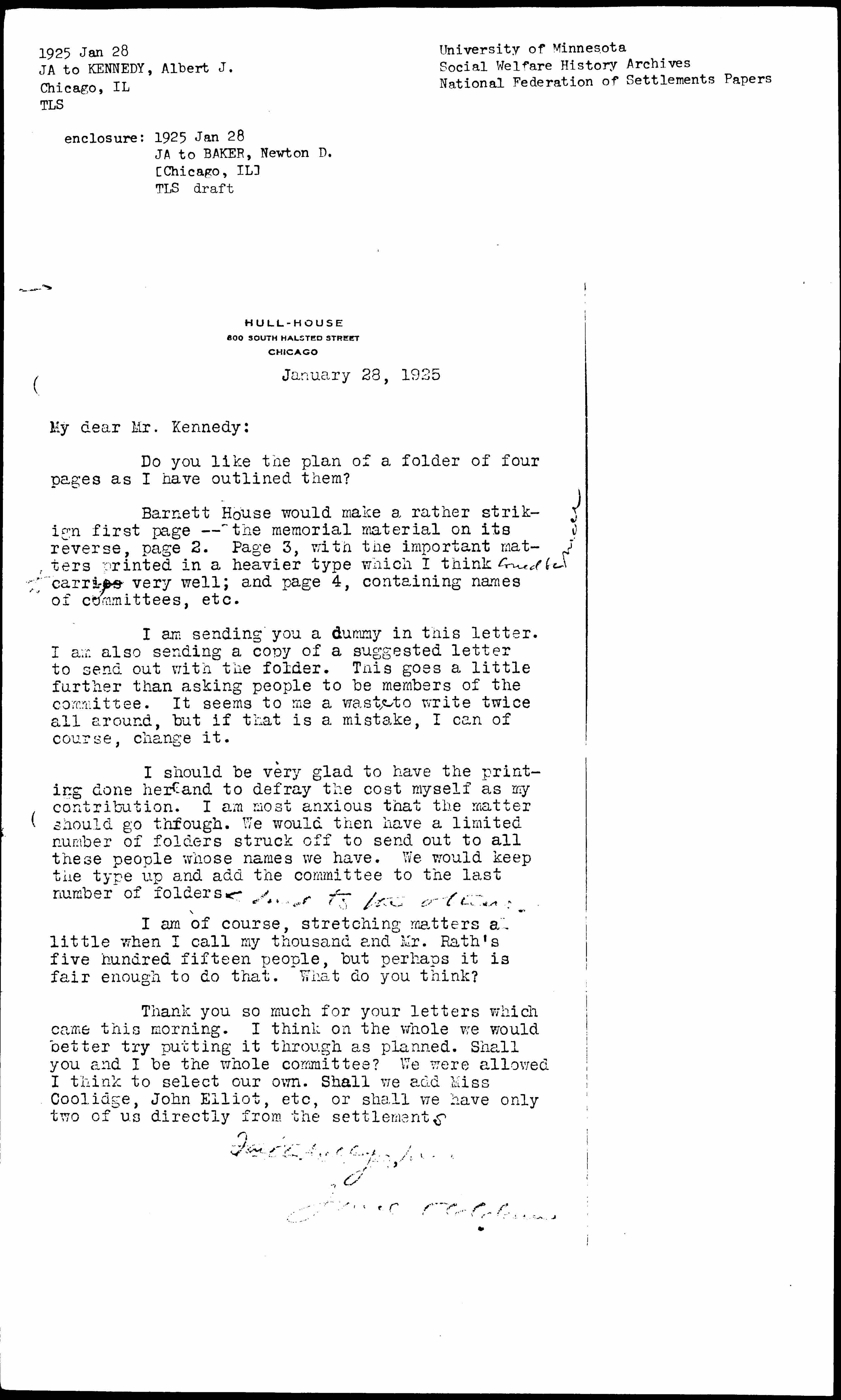 I am sending you a dummy in this letter. I am also sending a copy of a suggested letter to send out with the folder. This goes a little further than asking people to be members of the committee. It seems to me a waste to write twice all around, but if that is a mistake, I can of course, change it.
