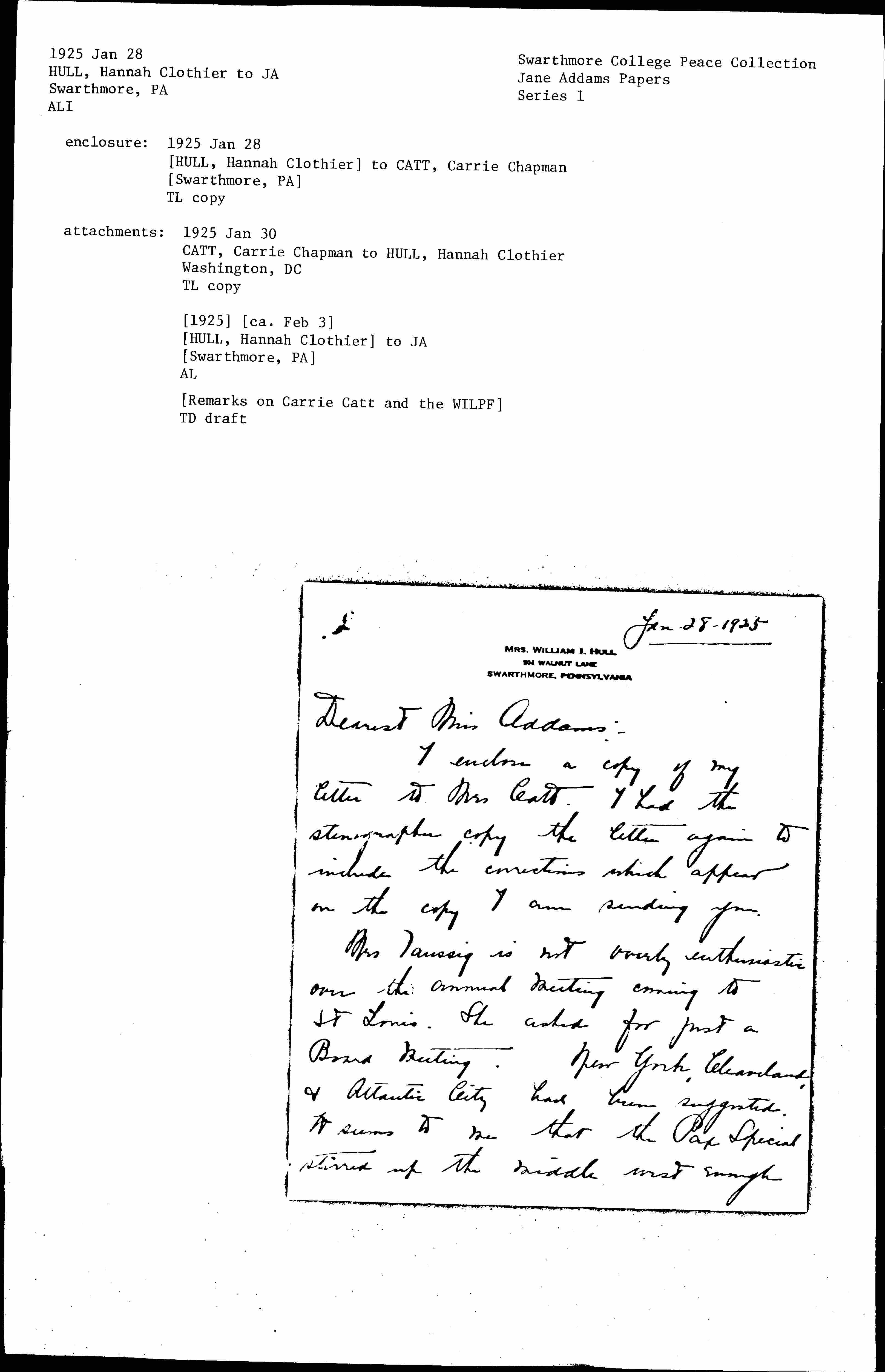 I enclose a copy of my letter to Mrs Catt. I had the stenographer copy the letter again to include the corrections which appear on the copy I am sending you.