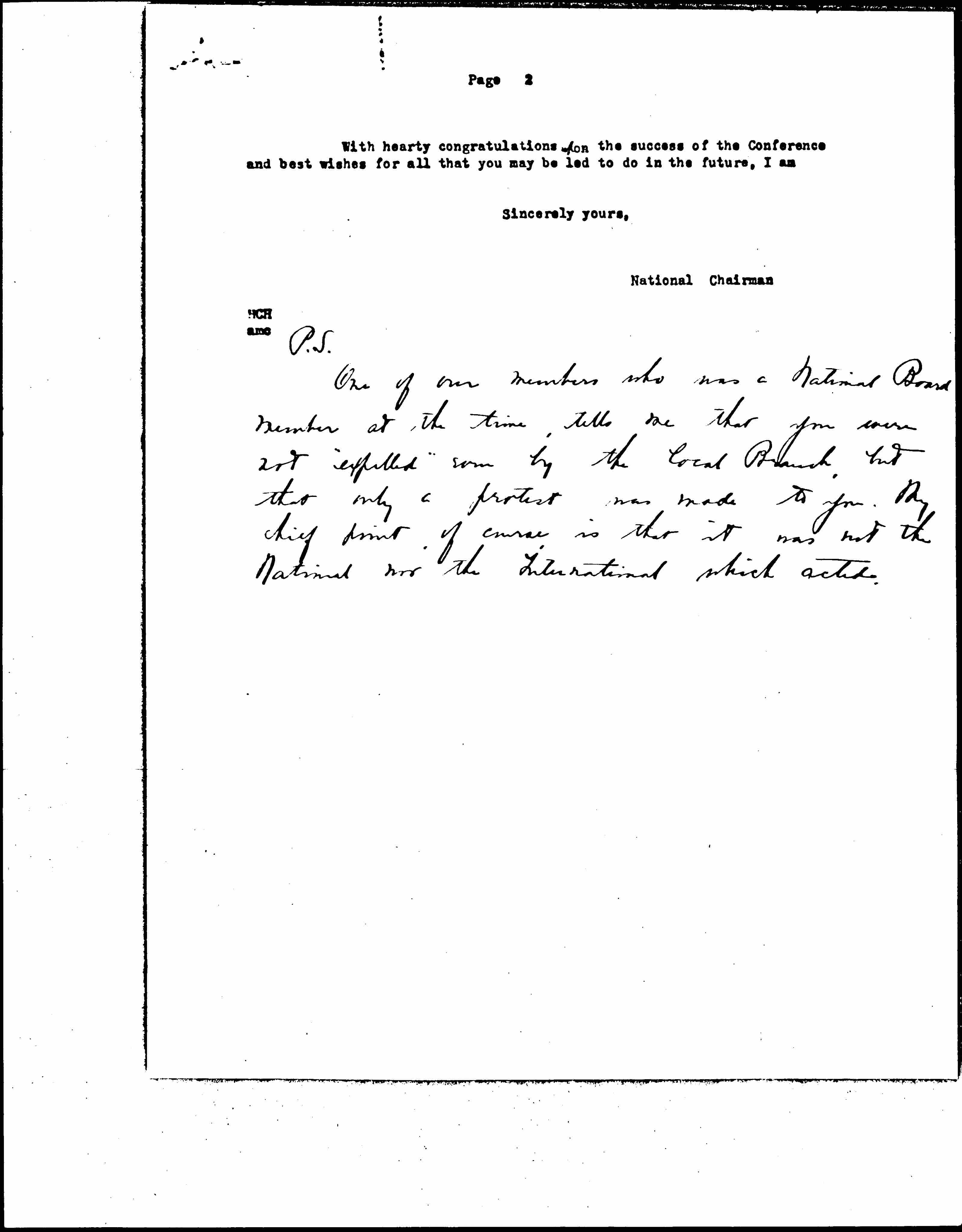 One of our members who was a National Board member at the time, tells me that you were not "expelled" even by the local Branch, but that only a protest was made to you. My chief point, of course, is that it was not the National nor the International which acted.↓