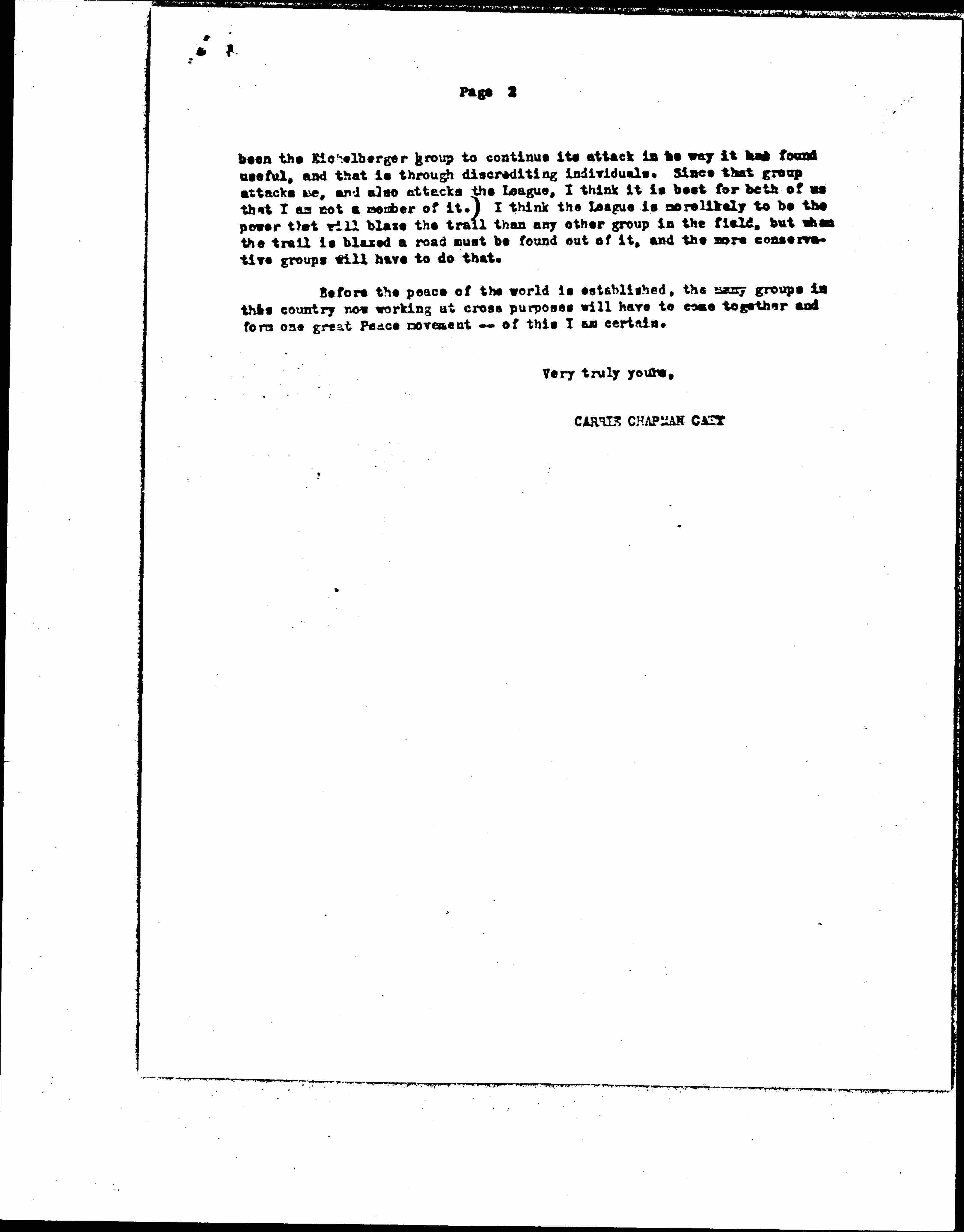 If you thought that I meant in any way to discredit the League, you are greatly mistaken. [written in right margin] ↑omit↓ ↑(↓ I believe that the things which are objectionable in the League to any other Peace advocate are to be found in the fact that it has drawn to it a good many of the hysterical variety, in what Mr. Roosevelt called the "lunatic fringe," and that those speak rather too loudly for it. All movements have suffered from what has also been called their "fool friends." This would have made little difference had there not [page 2] been the Eichelberger group to continue its attack in [the] way it had found useful, and that is through discrediting individuals. Since that group attacks me, and also attacks the League, I think it is best for both of us that I am not a member of it.↑)↓ I think the League is more likely to be the power that will blaze the trail than any other group in the field, but when the trail is blazed a road must be found out of it, and the more conservative groups will have to do that.