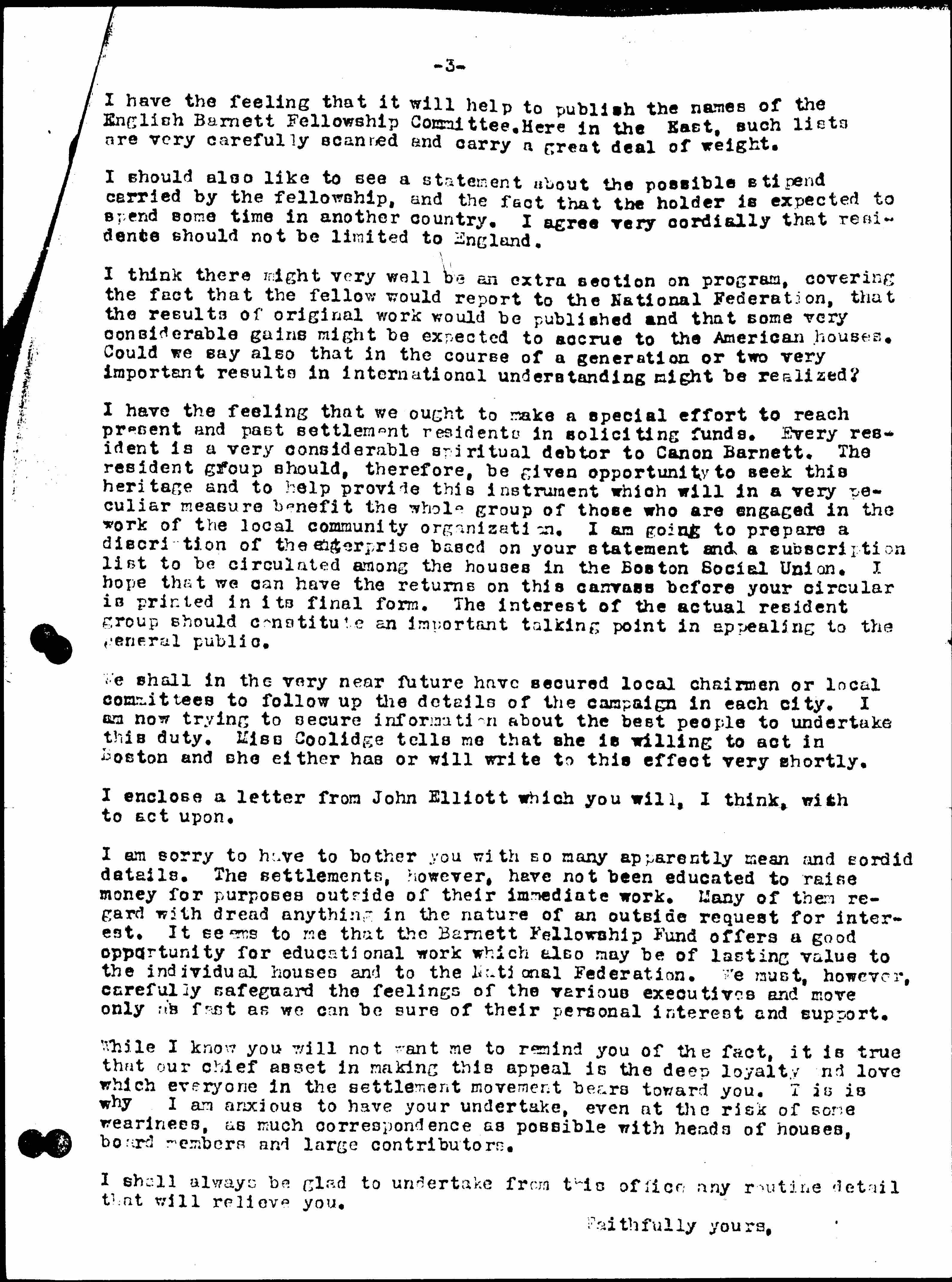 I have the feeling that we ought to make a special effort to reach present and past settlement residents in soliciting funds. Every resident is a very considerable spiritual debtor to Canon Barnett. The resident group should, therefore, be given opportunity to seek this heritage and to help provide this instrument which will in a very peculiar measure benefit the whole group of those who are engaged in the work of the local community organization. I am going to prepare a [description] of the enterprise based on your statement and a subscription list to be circulated among the houses in the Boston Social Union. I hope that we can have the returns on this canvass before your circular is printed in its final form. The interest of the actual resident group should constitute an important talking point in appealing to the general public.