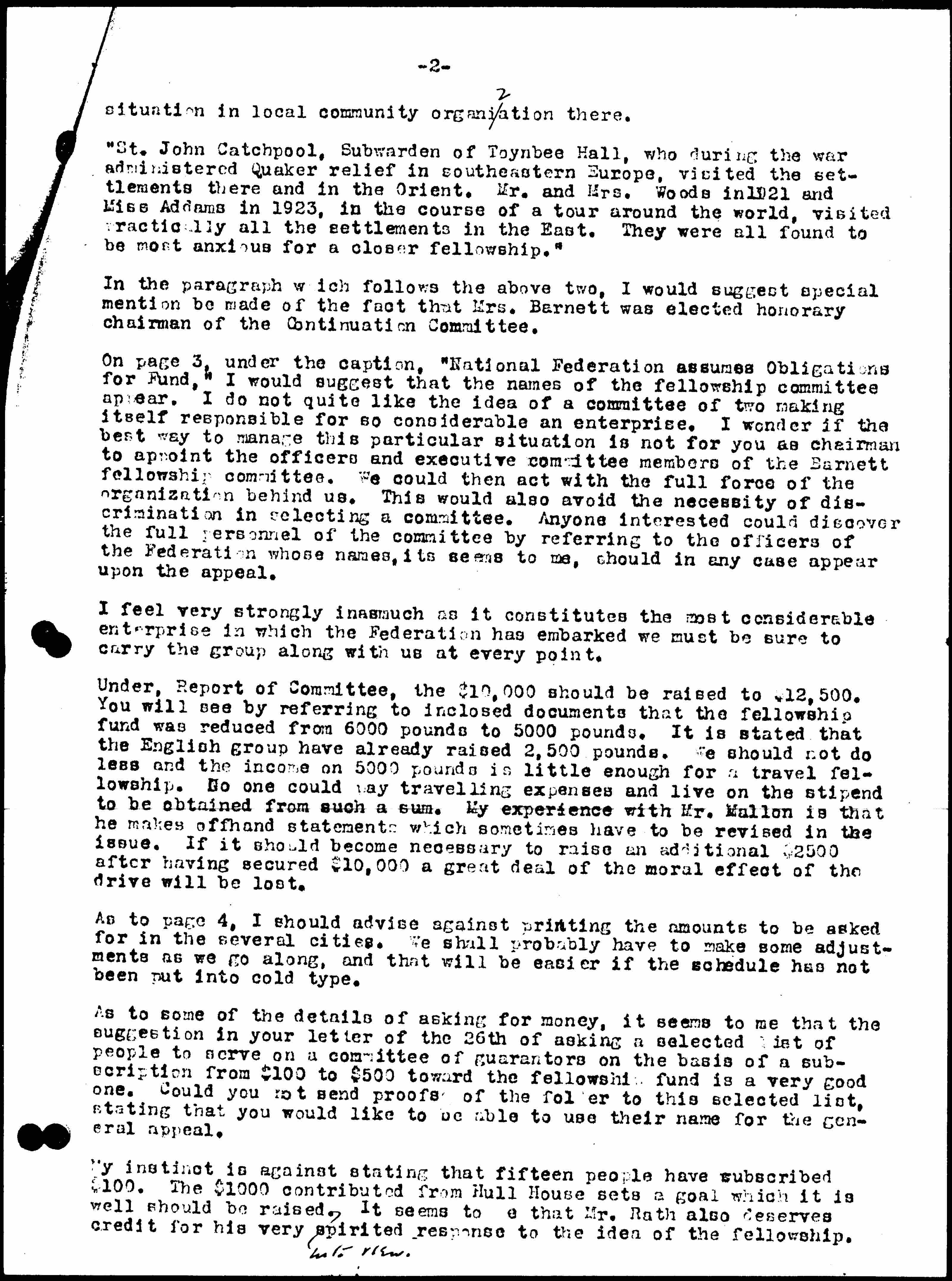 I am sorry to have to bother you with so many apparently mean and sordid details. The settlements, however, have not been educated to raise money for purposes outside of their immediate work. Many of them regard with dread anything in the nature of an outside request for interest. It seems to me that the Barnett Fellowship Fund offers a good opportunity for educational work which also may be of lasting value to the individual houses and to the National Federation. We must, however, carefully safeguard the feelings of the various executives and move only as fast as we can be sure of their personal interest and support.