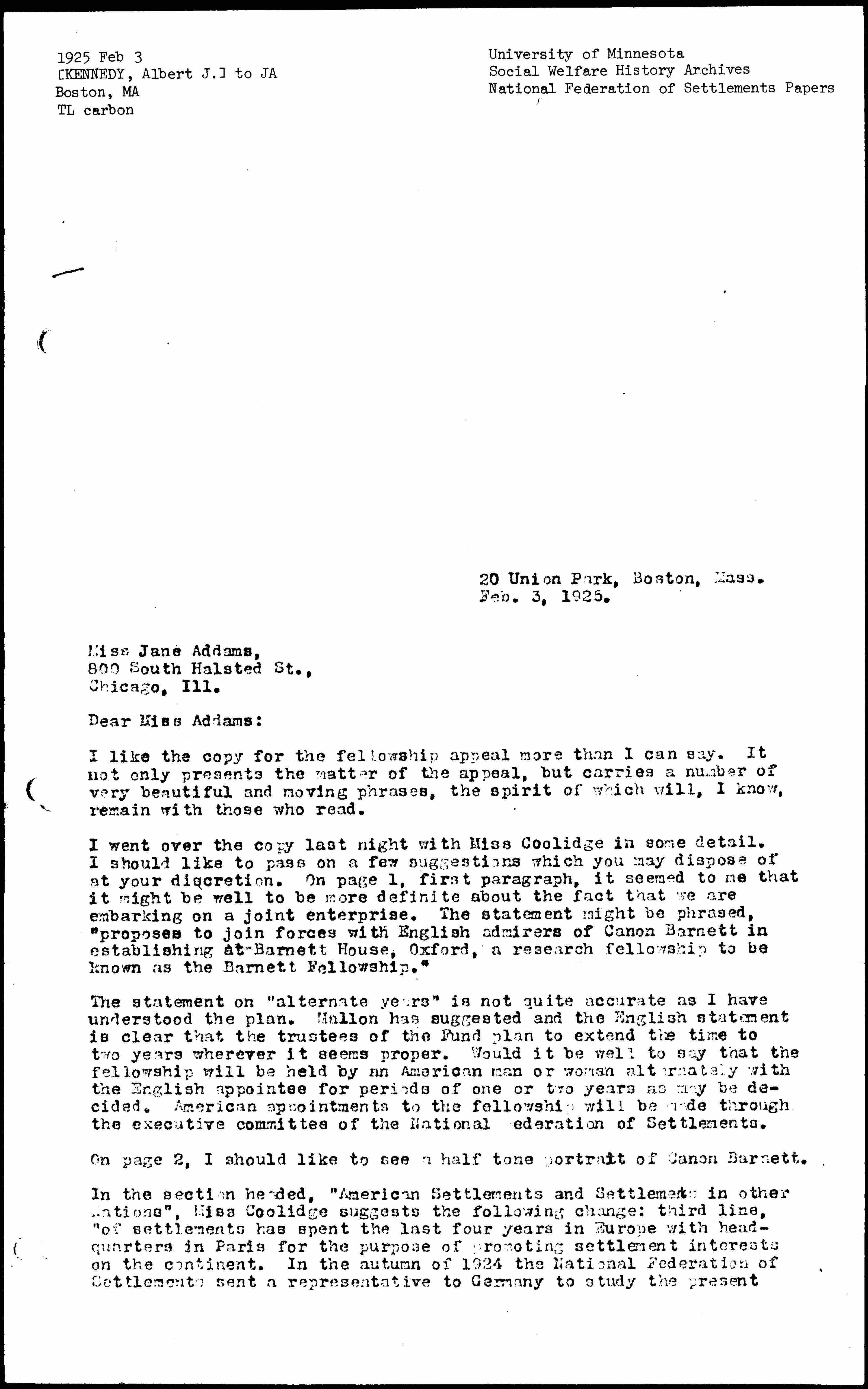 I went over the copy last night with Miss Coolidge in some detail. I should like to pass on a few suggestions which you may dispose of at your discretion. On page 1, first paragraph, it seemed to me that it might be well to be more definite about the fact that we are embarking on a joint enterprise. The statement might be phrased, "proposes to join forces with English admirers of Canon Barnett in establishing at Barnett House, Oxford, a research fellowship to be known as the Barnett Fellowship."
