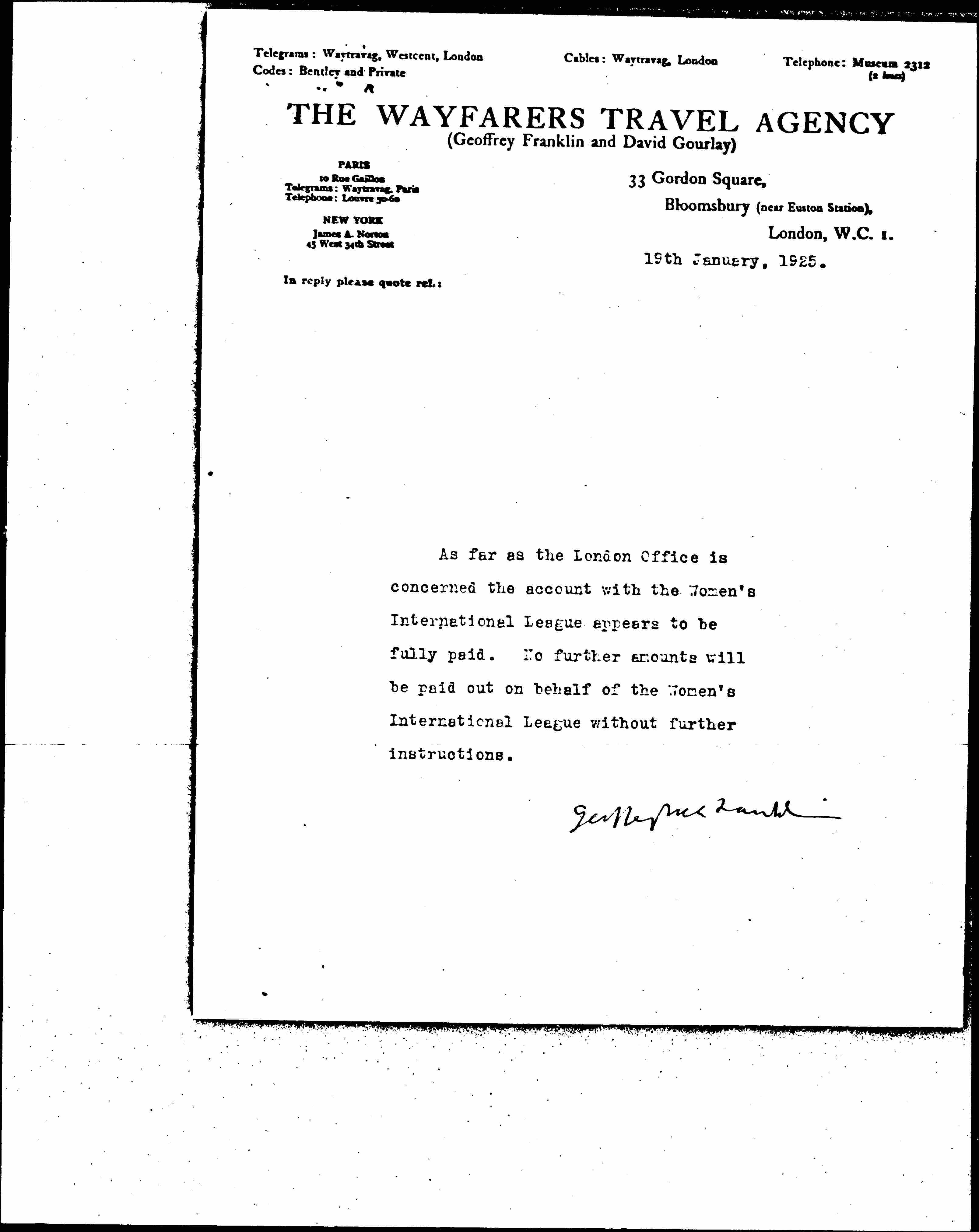 As far as the London Office is concerned the account with the Women's International League appears to be fully paid. No further accounts will be paid out on behalf of the Women's International League without further instructions.