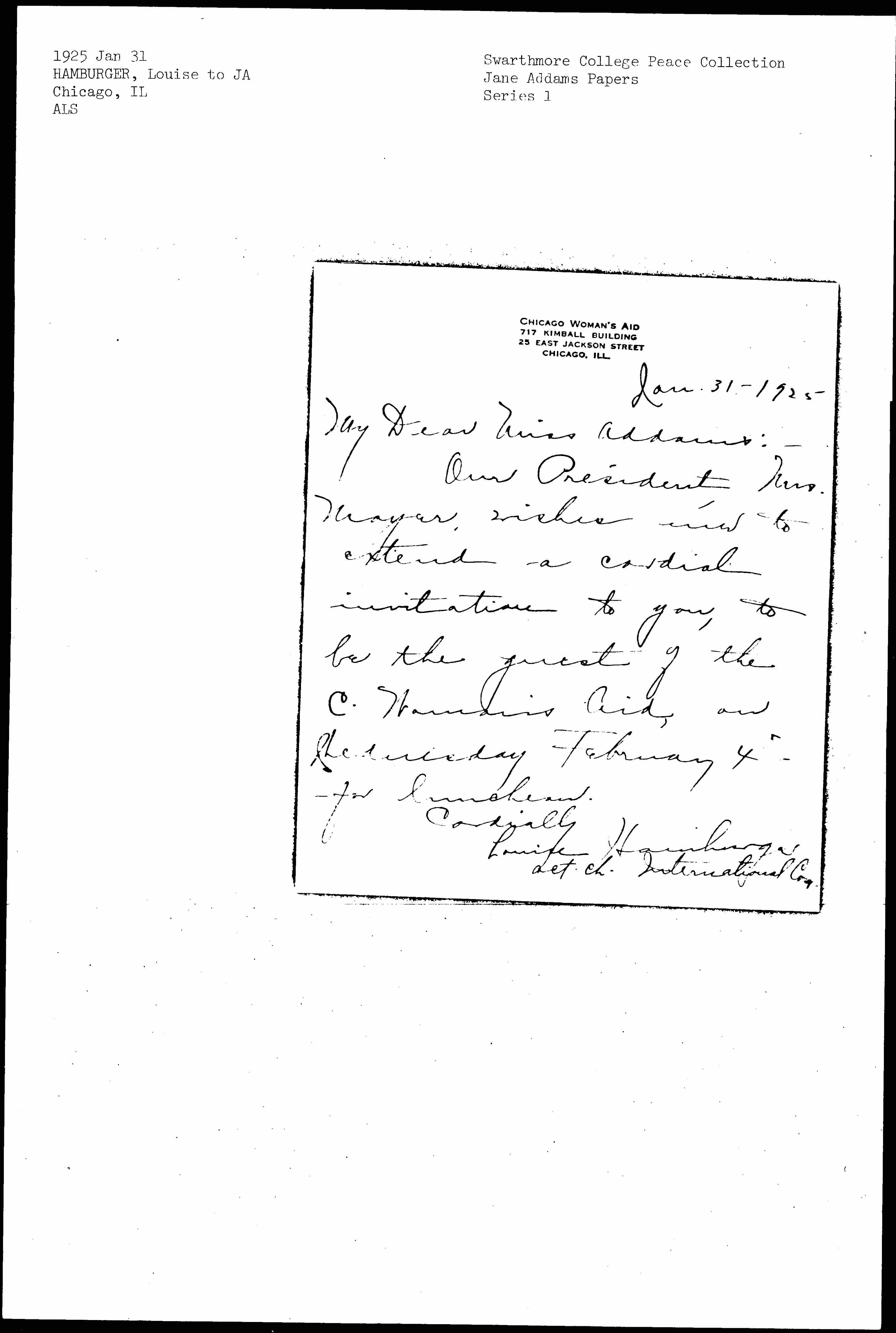 Our President Mrs. Mayer wishes me to extend a cordial invitation to you, to be the guest of the C. Woman's Aid, on Wednesday February 4th -- for luncheon.