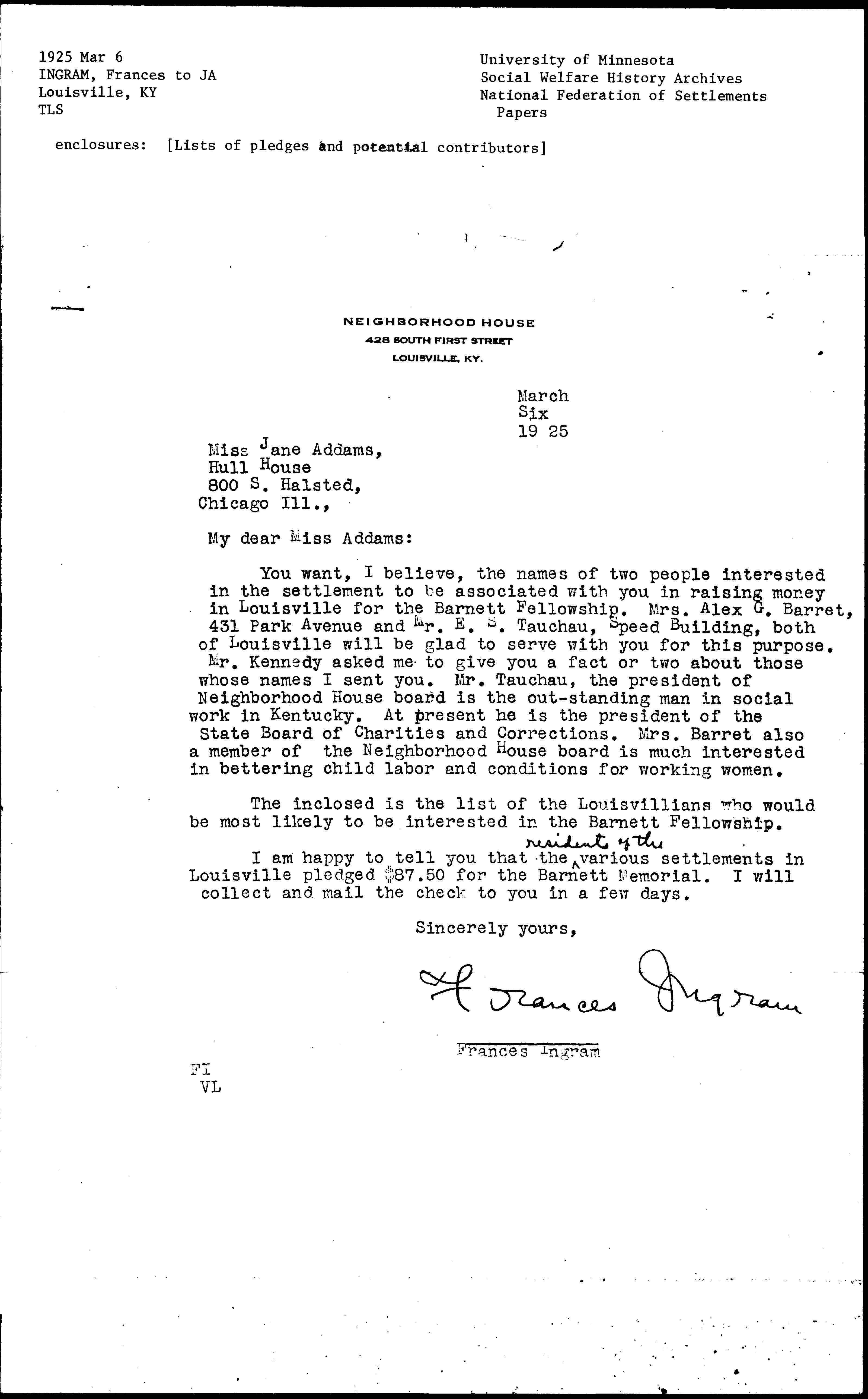 You want, I believe, the names of two people interested in the settlement to be associated with you in raising money in Louisville for the Barnett Fellowship. Mrs. Alex G. Barret, 431 Park Avenue and Mr. E. S. Tauchau, Speed Building, both of Louisville will be glad to serve with you for this purpose. Mr. Kennedy asked me to give you a fact or two about those whose names I sent you. Mr. Tauchau, the president of Neighborhood House board is the [outstanding] man in social work in Kentucky. At present he is the president of the State Board of Charities and Corrections. Mrs. Barret also a member of the Neighborhood House board is much interested in bettering child labor and conditions for working women.