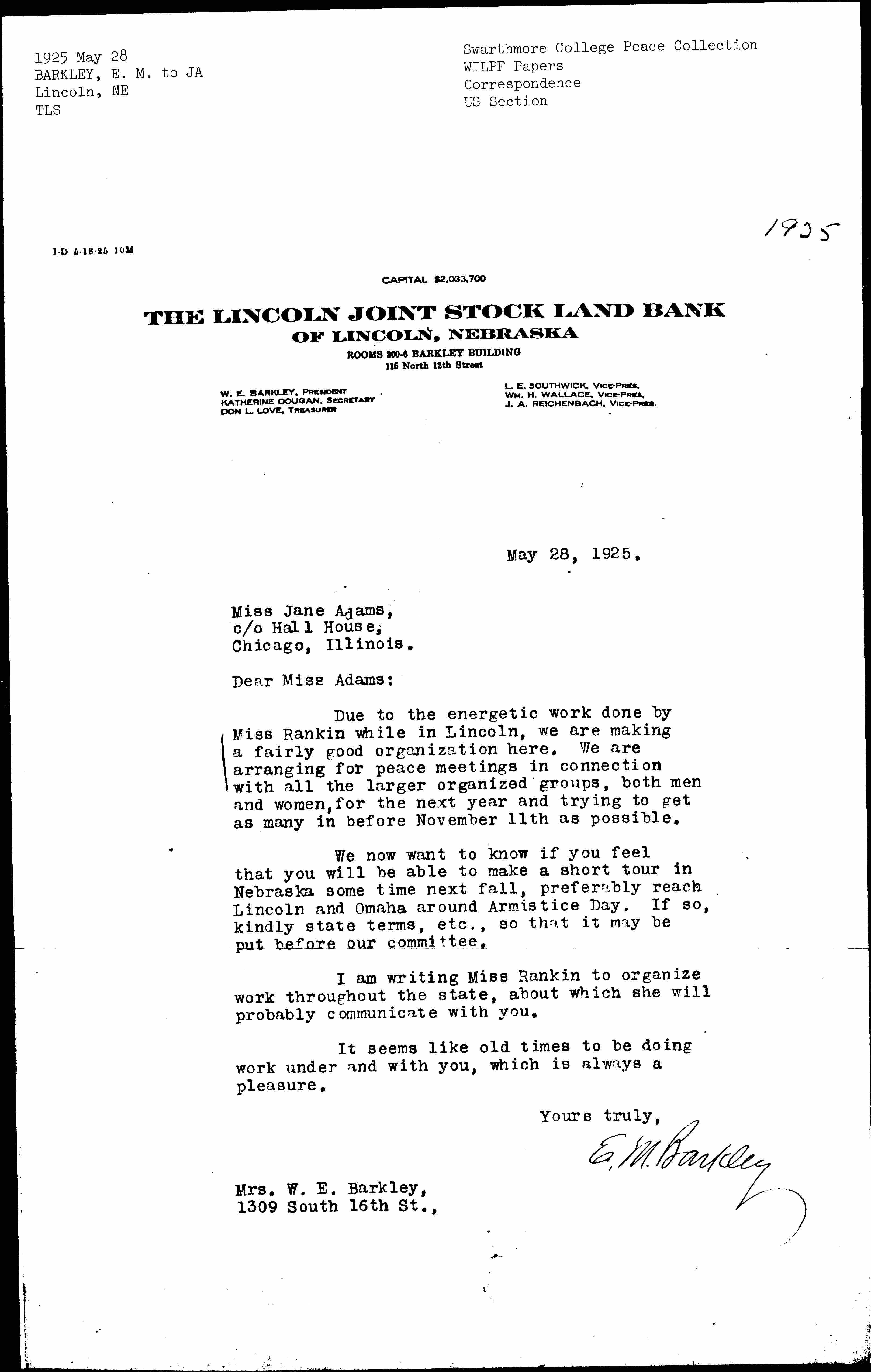Due to the energetic work done by Miss Rankin while in Lincoln, we are making a fairly good organization here. We are arranging for peace meetings in connection with all the larger organized groups, both men and women, for the next year and trying to get as many in before November 11th as possible.