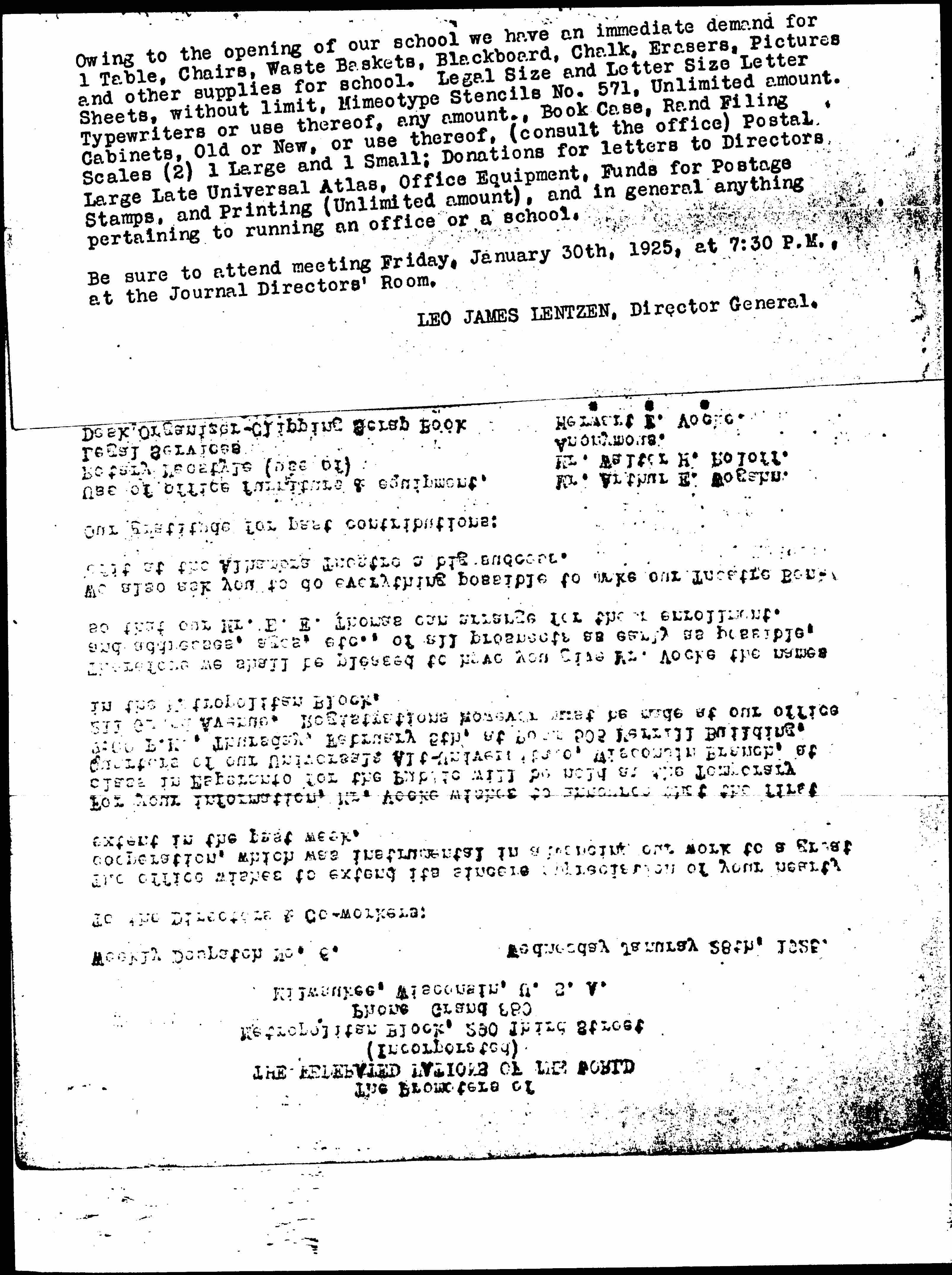 Other donations Anonymous. [page 2]Owing to the opening of our school we have an immediate demand for 1 Table, Chairs, Waste Baskets, Blackboard, Chalk, Erasers, Pictures and other supplies for school. Legal Size and Letter Size Letter Sheets, without limit, Mimeotype Stencils No. 571, Unlimited amount. Typewriters or use thereof, any amount., Book Case, Rand Filing Cabinets, Old or New, or use thereof, (consult the office) Postal Scales (2) 1 Large and 1 Small; Donations for letters to Directors, Large Late Universal Atlas, Office Equipment, Funds for Postage Stamps, and Printing (Unlimited amount), and in general anything pertaining to running an office or a school.