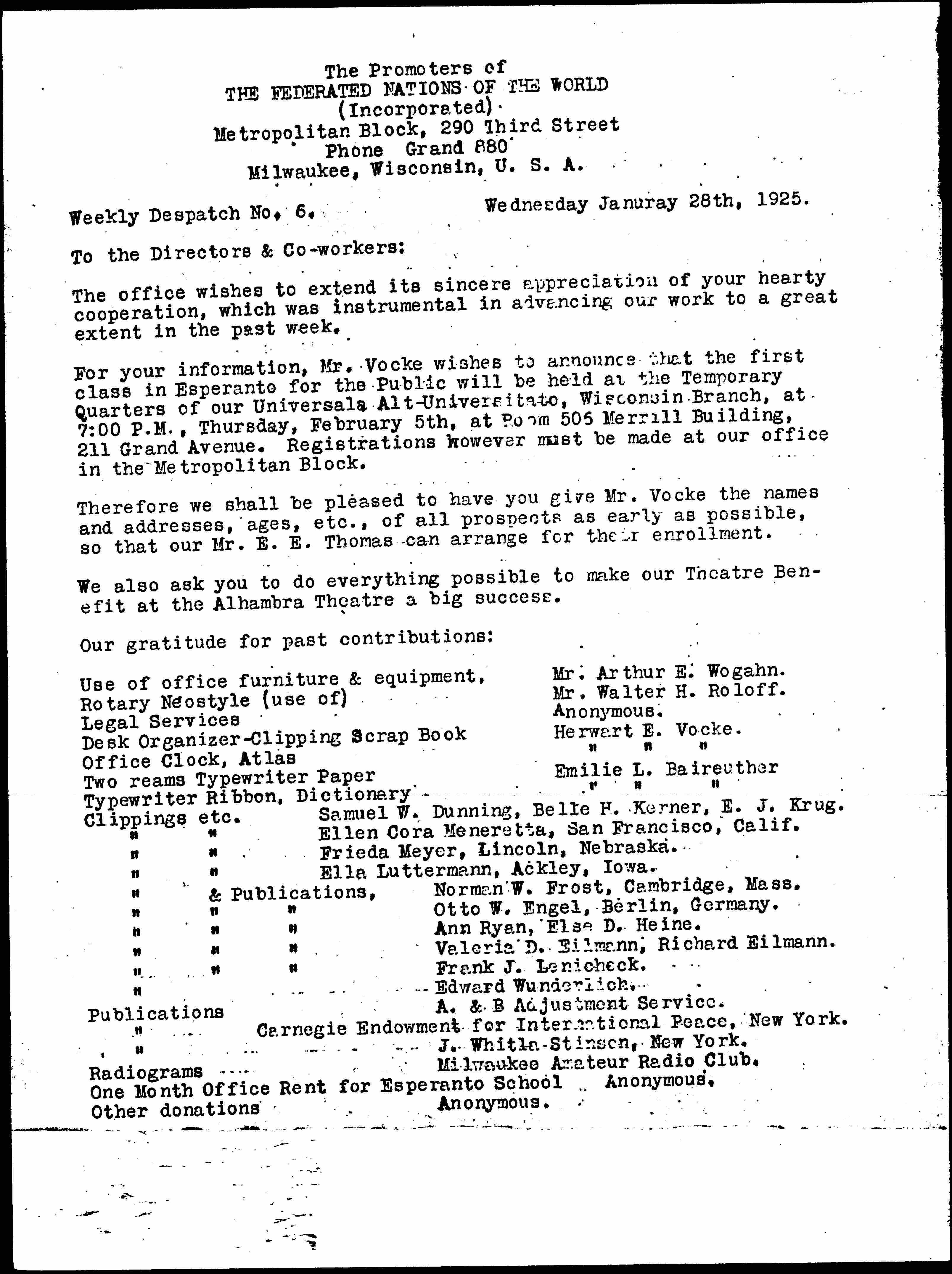 For your information, Mr. Vocke wishes to announce that the first class in Esperanto for the Public will be held at the Temporary Quarters of our Universala Alt-Universitato, Wisconsin Branch, at 7:00 P.M., Thursday, February 5th, at Room 505 Merrill Building, 211 Grand Avenue. Registrations however must be made at our office in the Metropolitan Block.