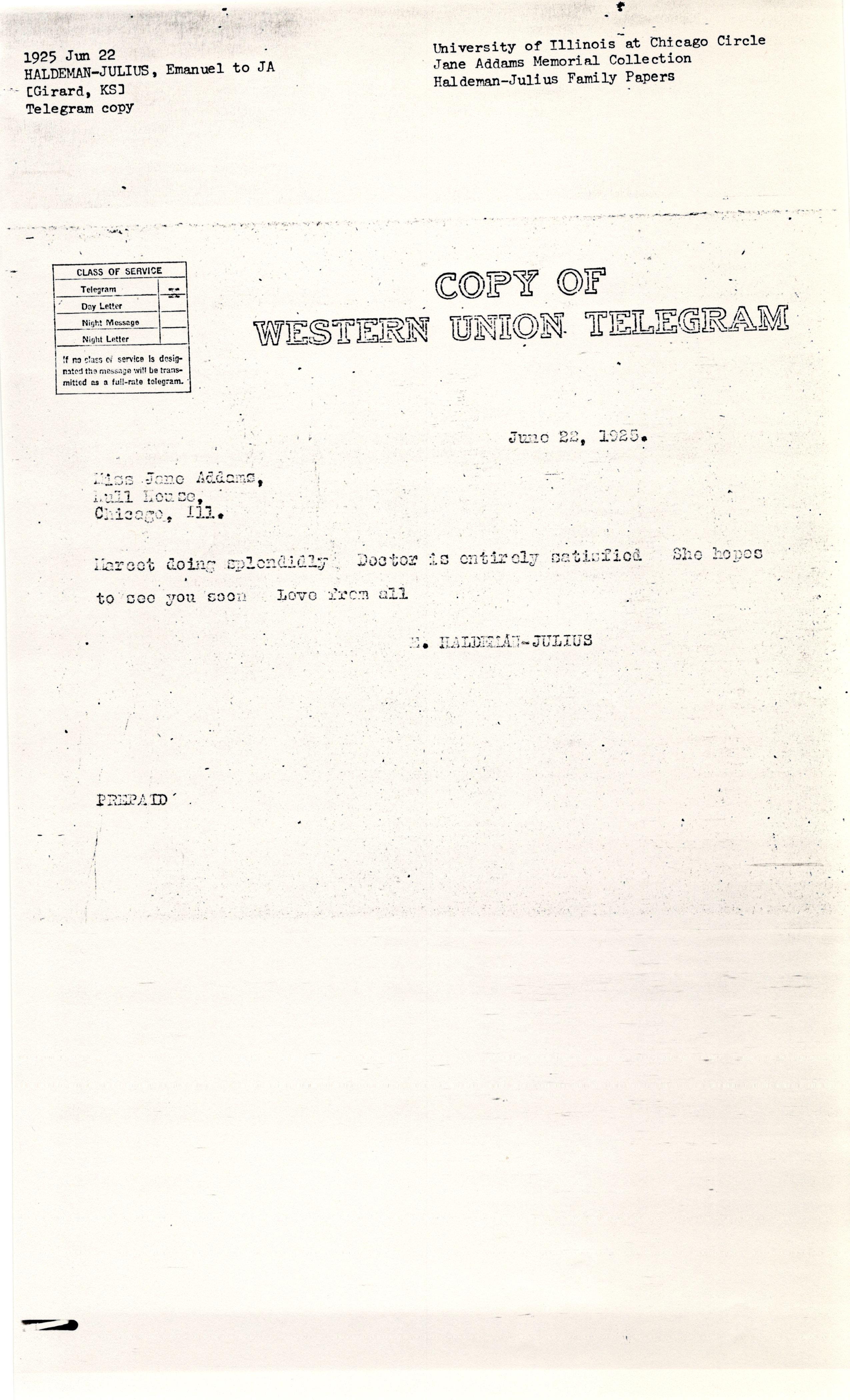 Marcet doing splendidly. Doctor is entirely satisfied. She hopes to see you soon. Love from all