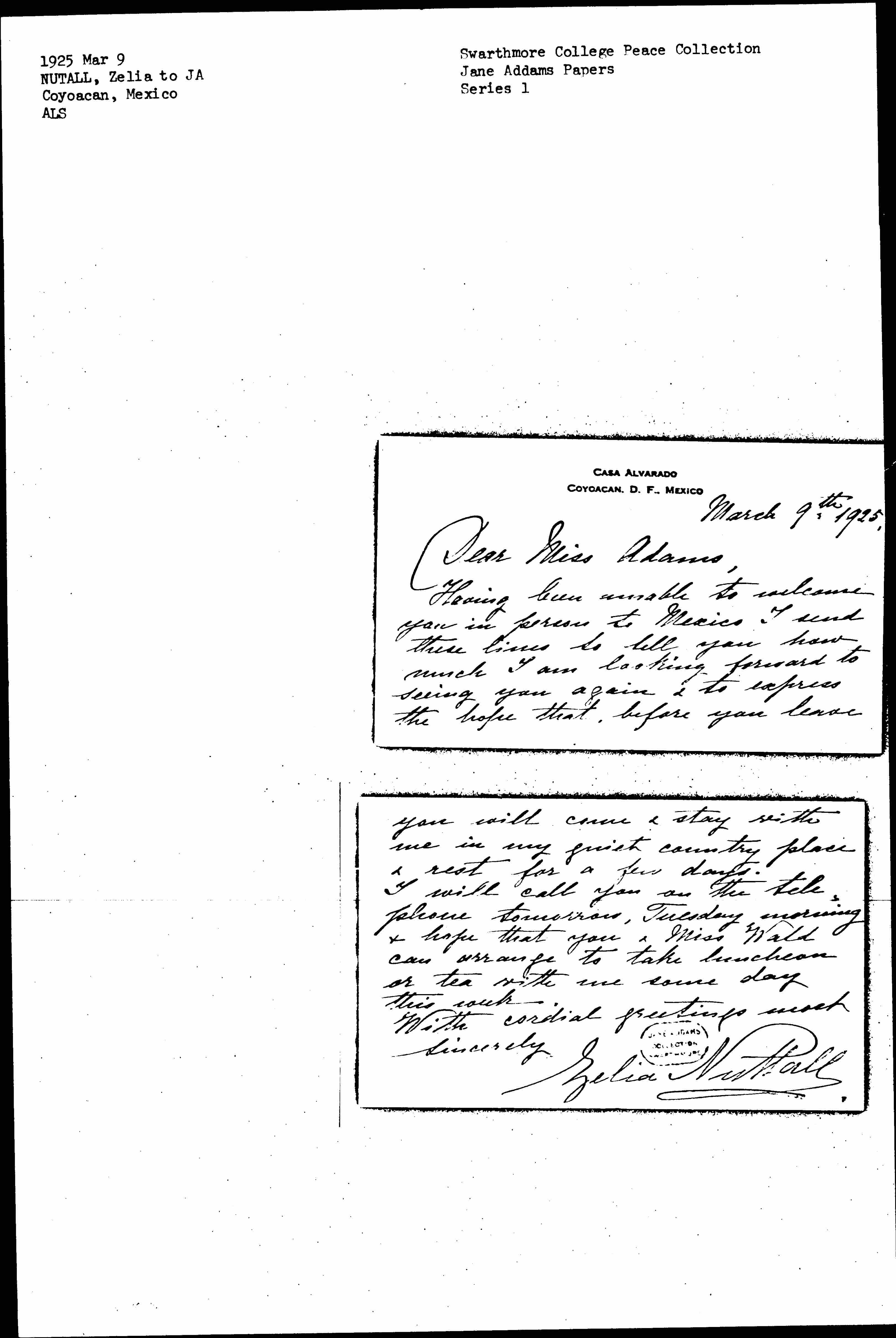 Having been unable to welcome you in person to Mexico I send these lines to tell you how much I am looking forward to seeing you again & to express the hope that, before you leave [page 2] you will come & stay with me in my quiet country place & rest for a few days.