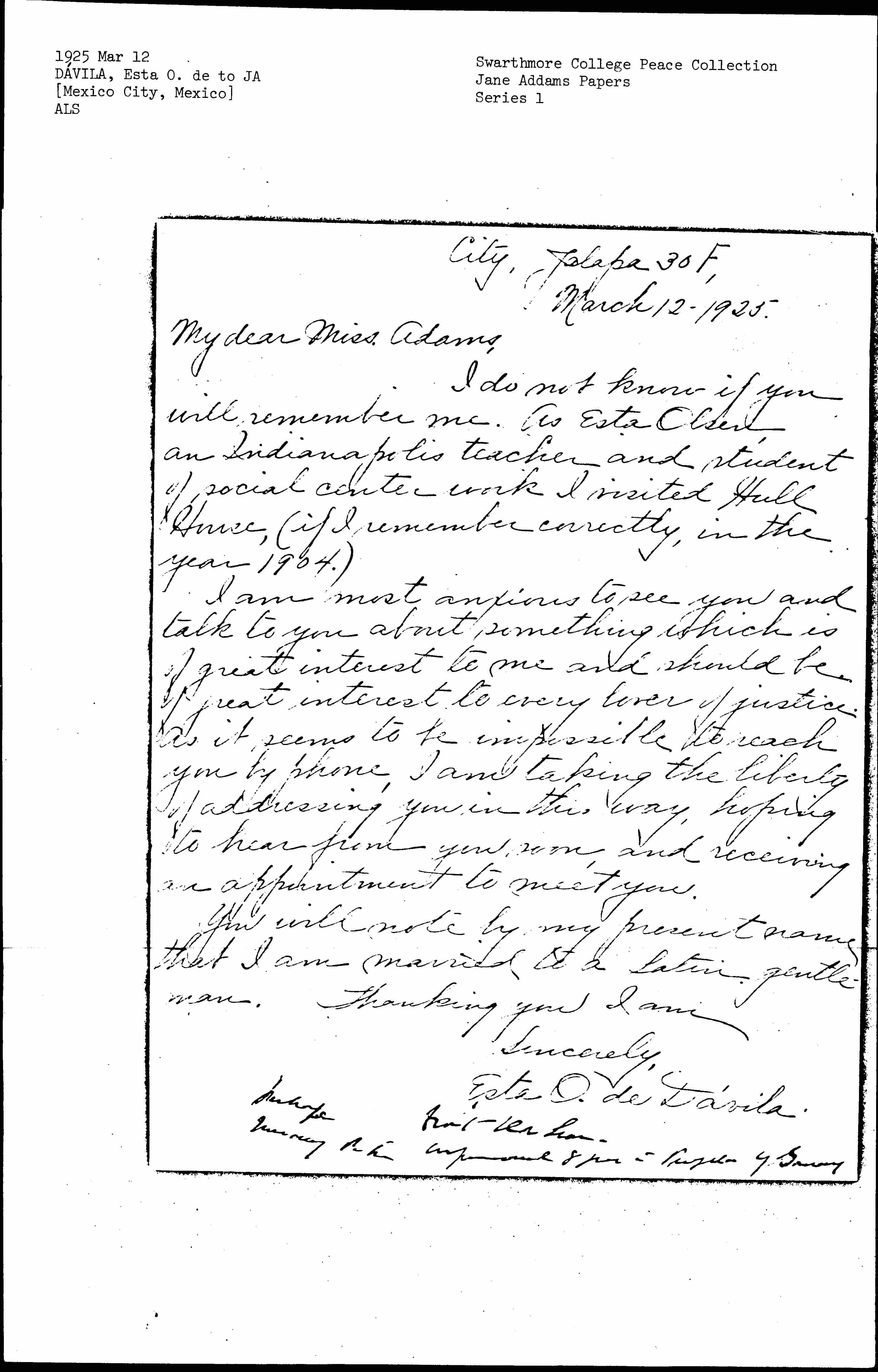 Esta Olsen de Dávila to Jane Addams, March 12, 1925