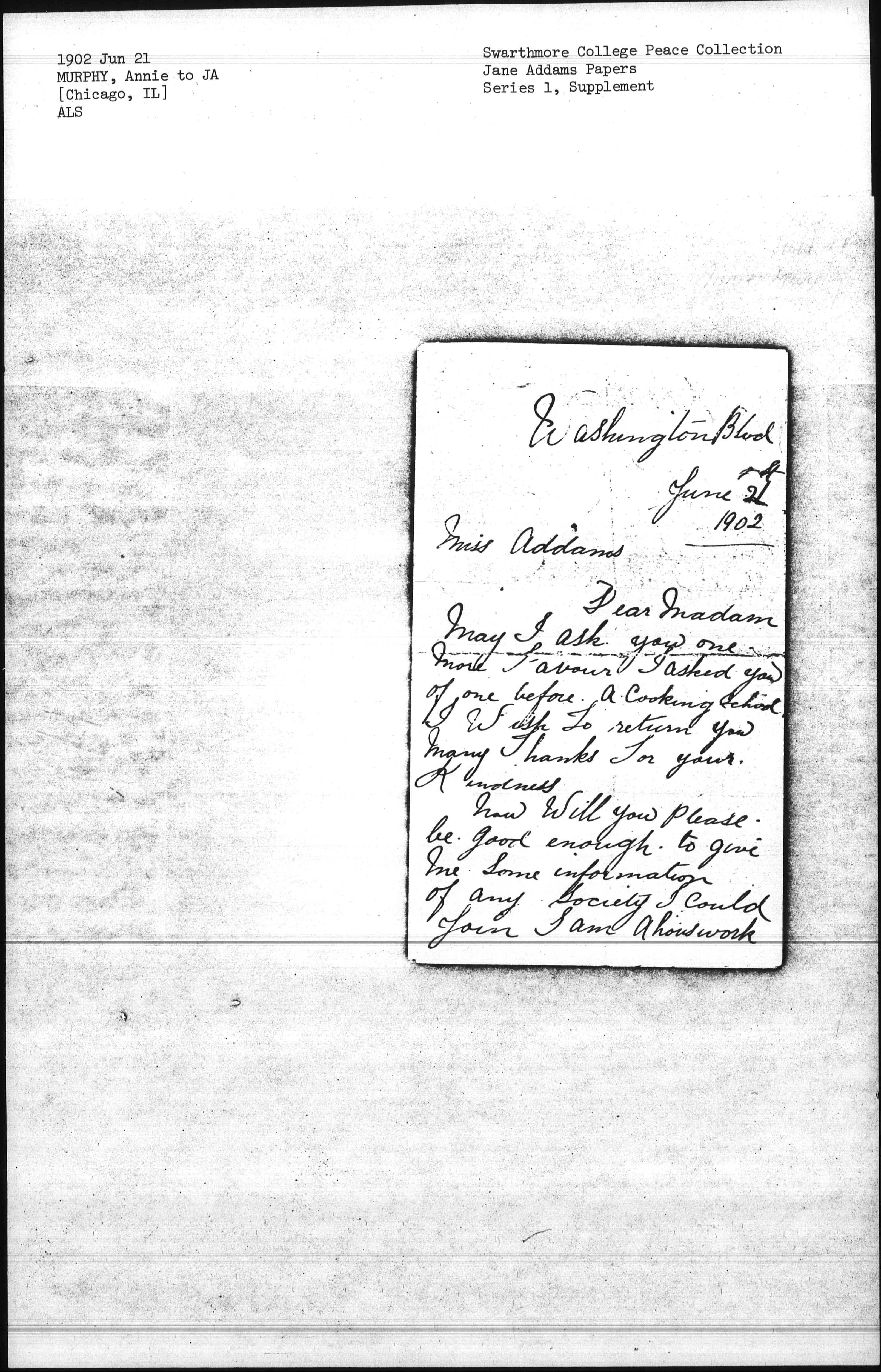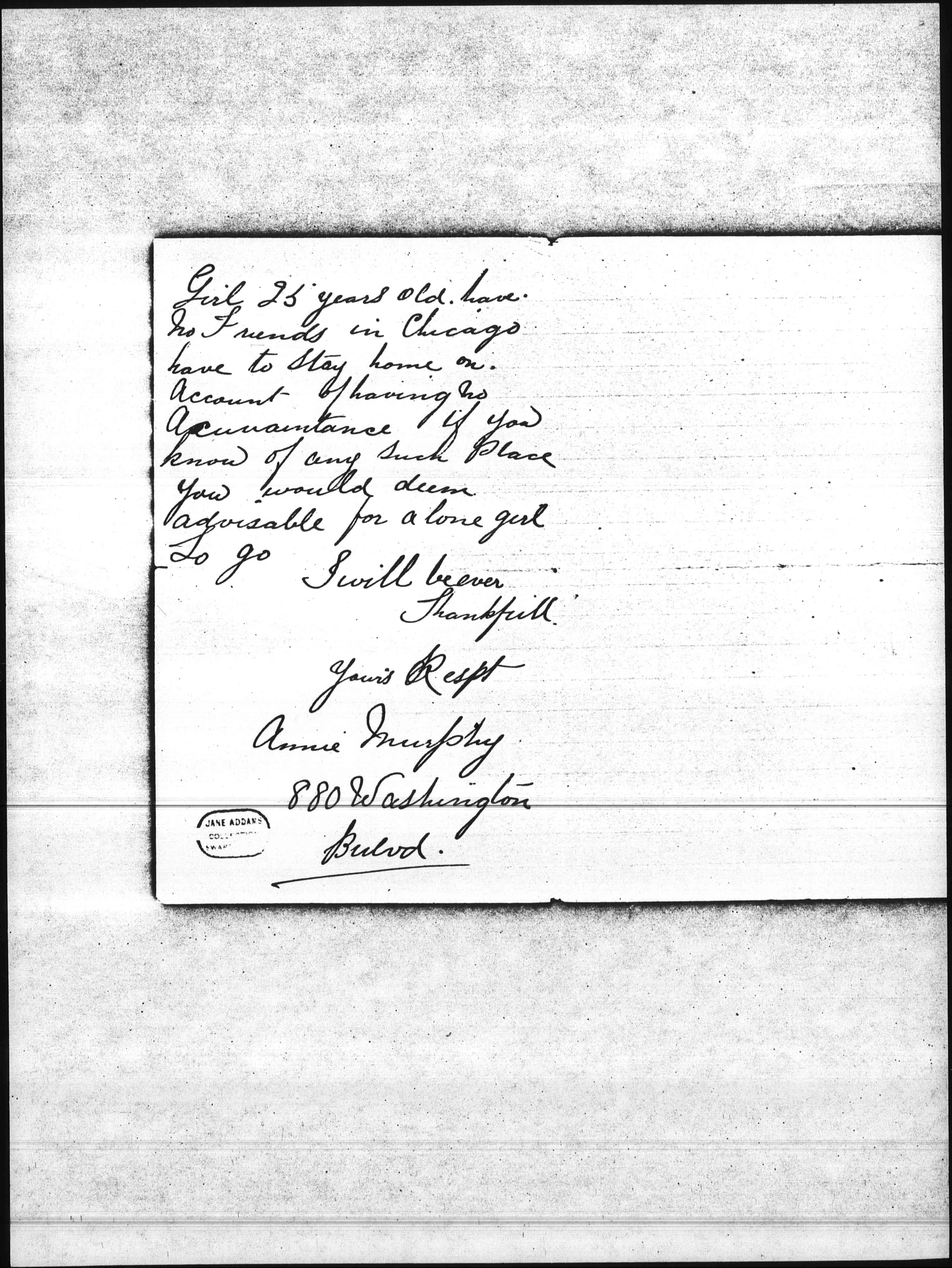 Now Will you please be good enough to give me some information of any Society I could form I am a houswork [page 2] Girl 25 years old have no Friends in Chicago have to stay home on account of having no [acquaintance] if you know of any such place you would deem advisable a lone girl To go.