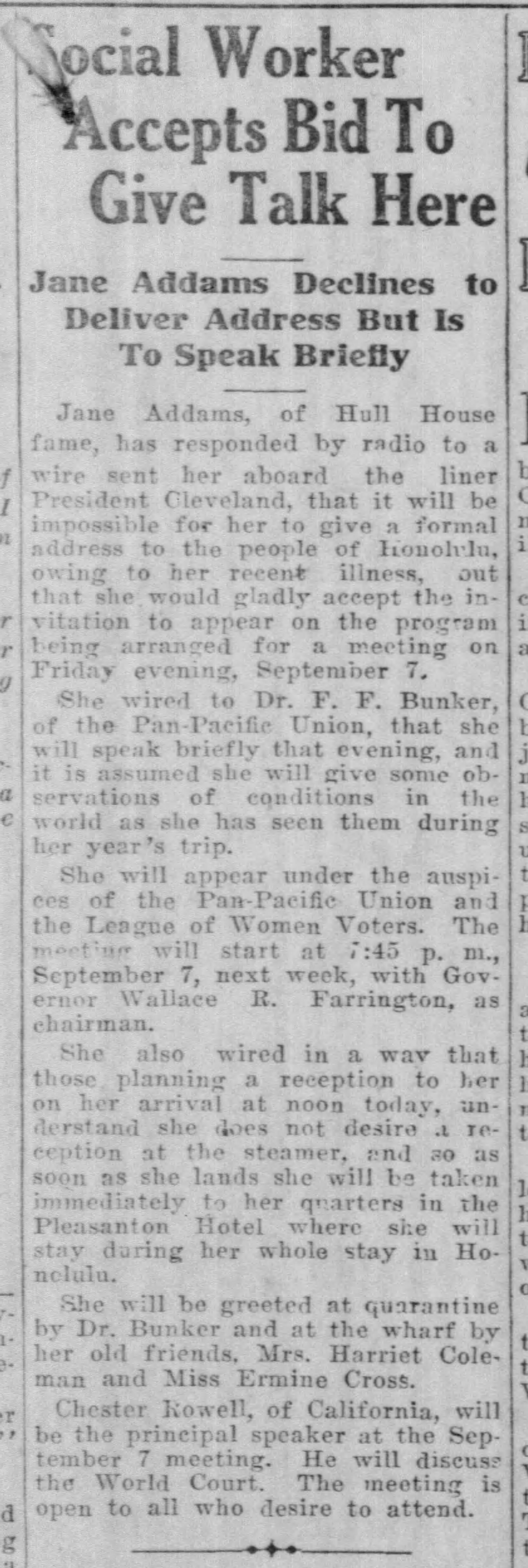 Jane Addams, of Hull House fame, has responded by radio to a wire sent her aboard the liner President Cleveland, that it will be impossible for her to give a formal address to the people of Honolulu, owing to her recent illness, but that she would gladly accept the invitation to appear on the program being arranged for a meeting on Friday evening, September 7.