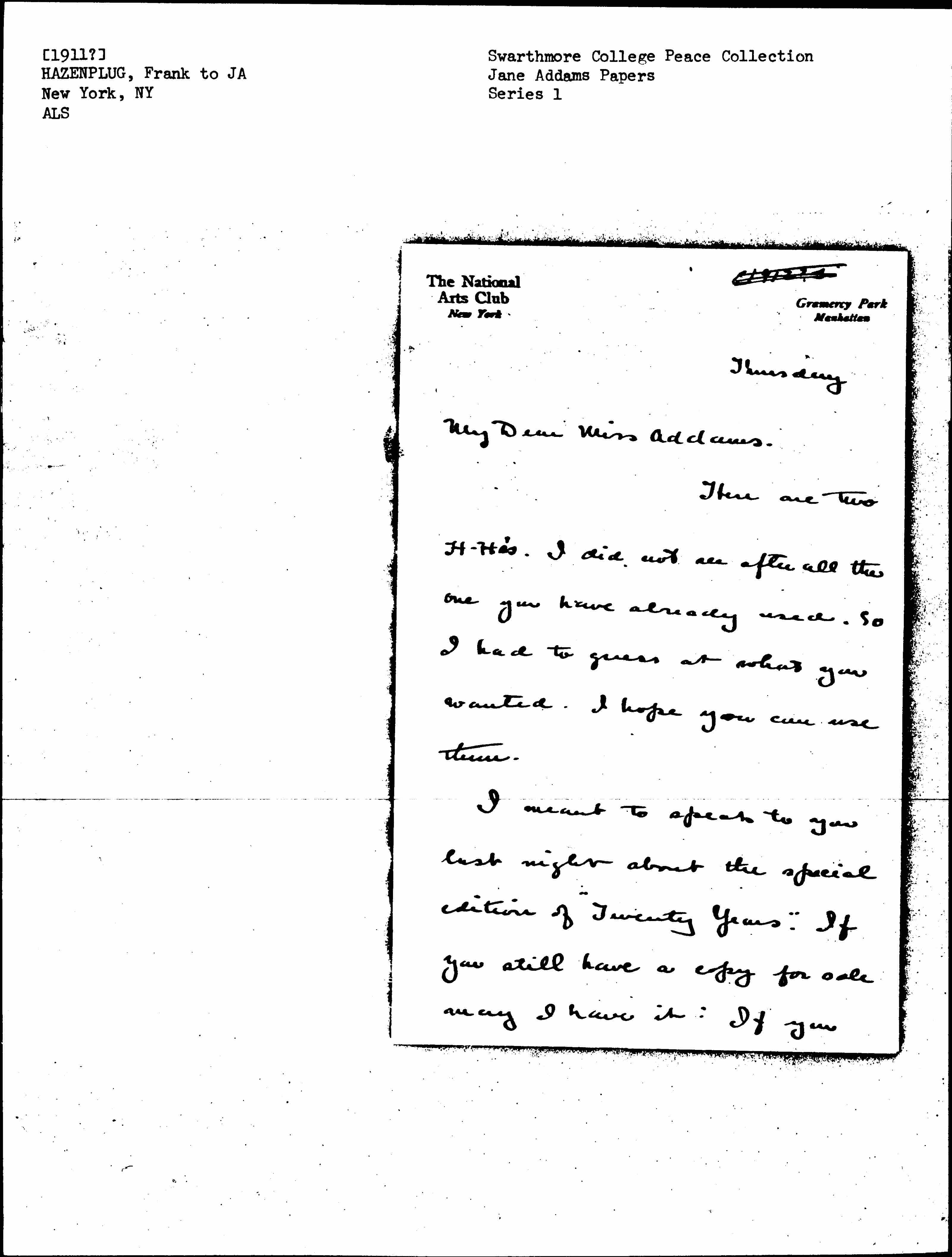 I meant to speak to you last night about the special edition of "Twenty Years." If you still have a copy for sale may I have it: If you [page 2] would have Grace send it to me here I should be so much obliged.